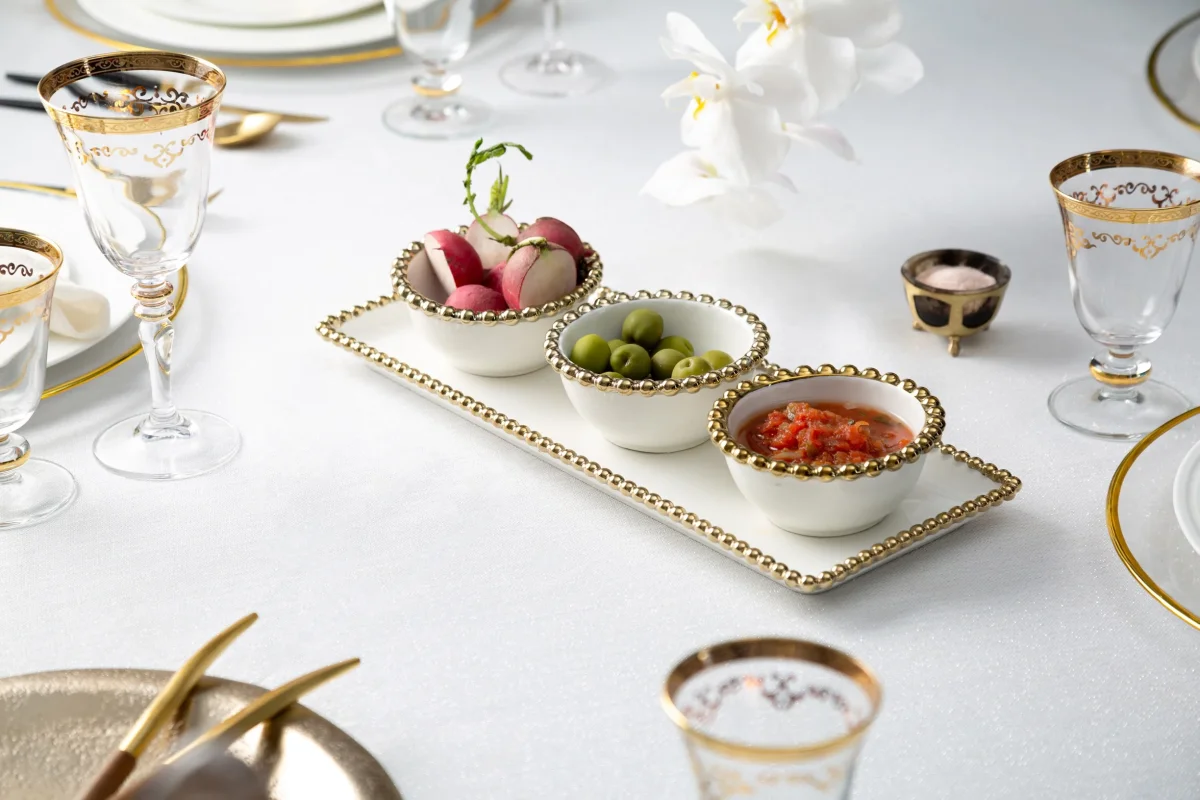 Vergroot uw tafeldecor met deze zalige gerechten met gouden kralen. Met drie kleine kommen, is het perfect geproportioneerd om romige dips of sauzen uit te zetten tijdens etentjes. Dit gerecht is veelzijdig genoeg om te gebruiken voor elegante gelegenheden of gezellige familiediners.