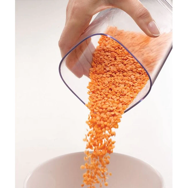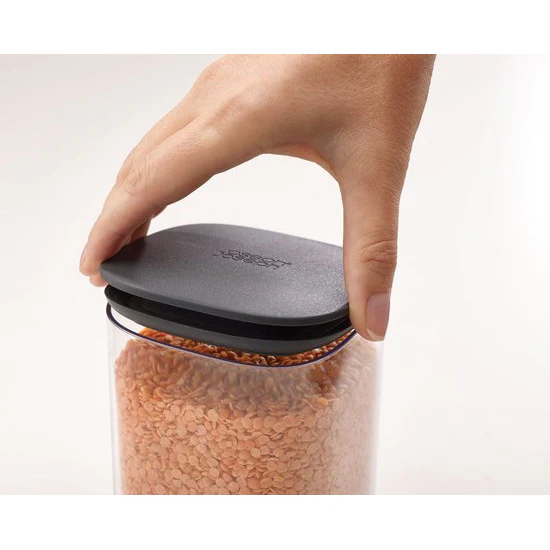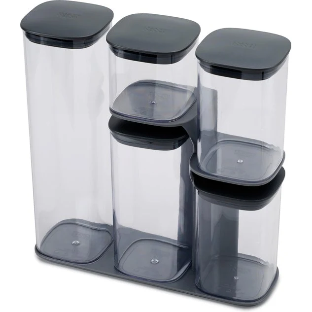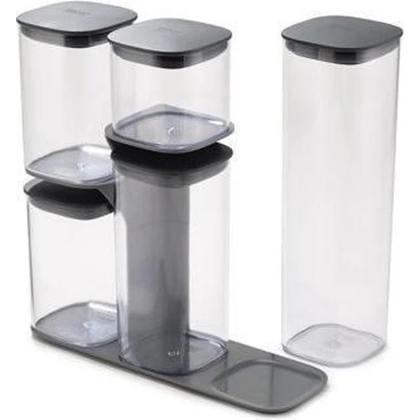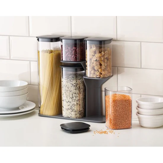 Houd verschillende ingrediënten langer vers met deze voorraadbussen van Joseph Joseph. Vul deze set van vijf vershouddozen met rijst, pasta, linzen of juist met je favoriete ontbijtgranen. Met het strakke design past deze organizer goed bij elke moderne keuken. Deze keukenkast organizer is perfect om ruimte te besparen in je keukenkast en etenswaar luchtdicht te bewaren. De transparante bakjes van sterk kunststof staan op een houder met twee etages waar je ze makkelijk vanaf kunt pakken en terug kunt zetten. De gehele set heeft een afmeting van 31,5 cm breed, 10 cm diep en 32,5 cm hoog. De bakjes zijn van verschillende groottes: een bak met een inhoud van 1,9 liter, een met 1,3 liter, twee met 900 ml en een met 500 ml. De plastic bakjes met deksel kunnen alleen met de hand gereinigd worden. De set met 3 voorraadbussen is 20 cm breed, 10 cm diep en 21 cm hoog. Keukenkast opbergsysteem Het unieke aan deze set met voedselopbergers, is dat deze zó ontworpen zijn dat je ze afzonderlijk van elkaar kunt pakken zonder dat je anderen hoeft te verzetten. Dat is pas handig! Daarnaast zie je in één oogopslag wat je nog allemaal op voorraad hebt. Heb je net niet genoeg ruimte in je keuken voor deze 5-delige set? Deze voorraadbussen zijn gelukkig ook beschikbaar als 3-delige set: > Voorraadbussen 3-delig – Joseph Joseph