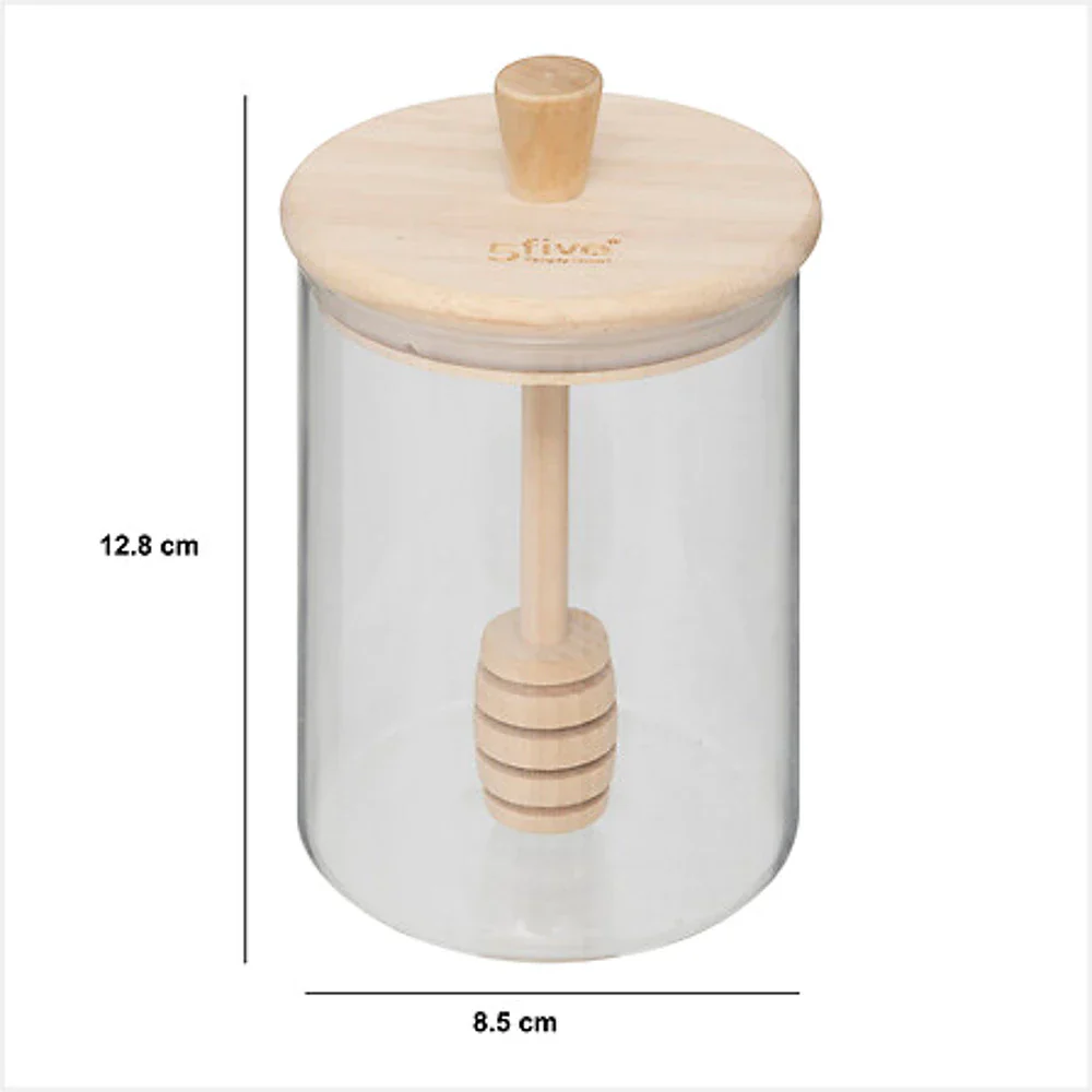 Bewaar en serveer honing op een stijlvolle en praktische manier met deze 5Five honingpot van glas en bamboe. Dankzij het transparante glas zie je in één oogopslag de inhoud, terwijl het bamboe deksel zorgt voor een warme, natuurlijke uitstraling op je aanrecht of eettafel. De meegeleverde honinglepel van esdoornhout maakt het doseren eenvoudig en knoeivrij, ideaal voor bij het ontbijt, thee of tijdens het bakken. Met een inhoud van circa 400 ml is deze honingpot perfect voor dagelijks gebruik en een echte blikvanger in elke keuken.