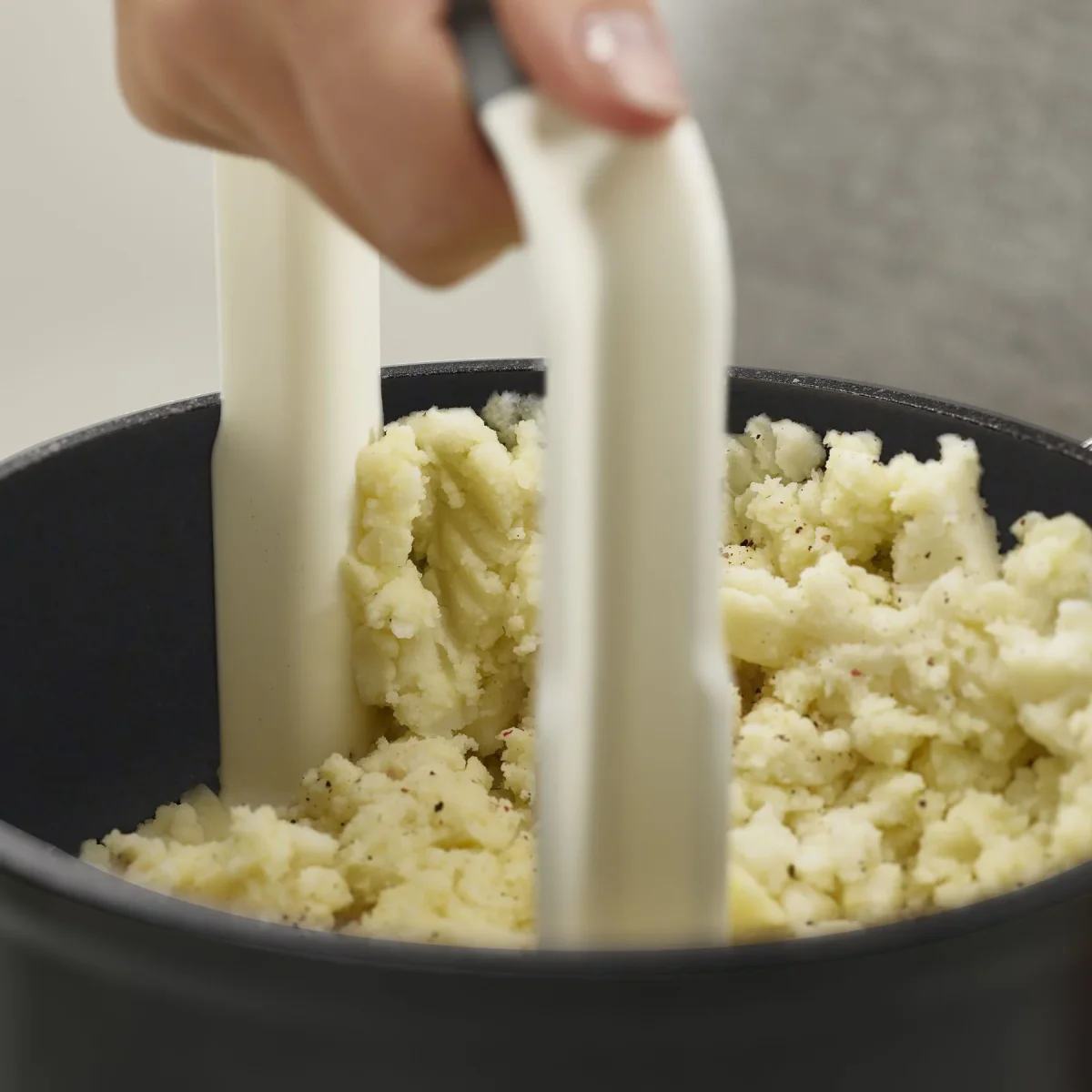 Deze Easy-Mash aardappelstamper heeft een heel andere vorm zodat hij veel praktischer is en hij gemakkelijk opbergt. De ergonomische ‘D’ vorm zorgt ervoor dat je heel gemakkelijk de aardappels kunt pureren. Bij de Easy-Mash zijn de randen zo gevormd dat je de aardappel gemakkelijk van de rand van de pot kunt schrapen. Het handvat heeft een comfortabele anti-slip greep.