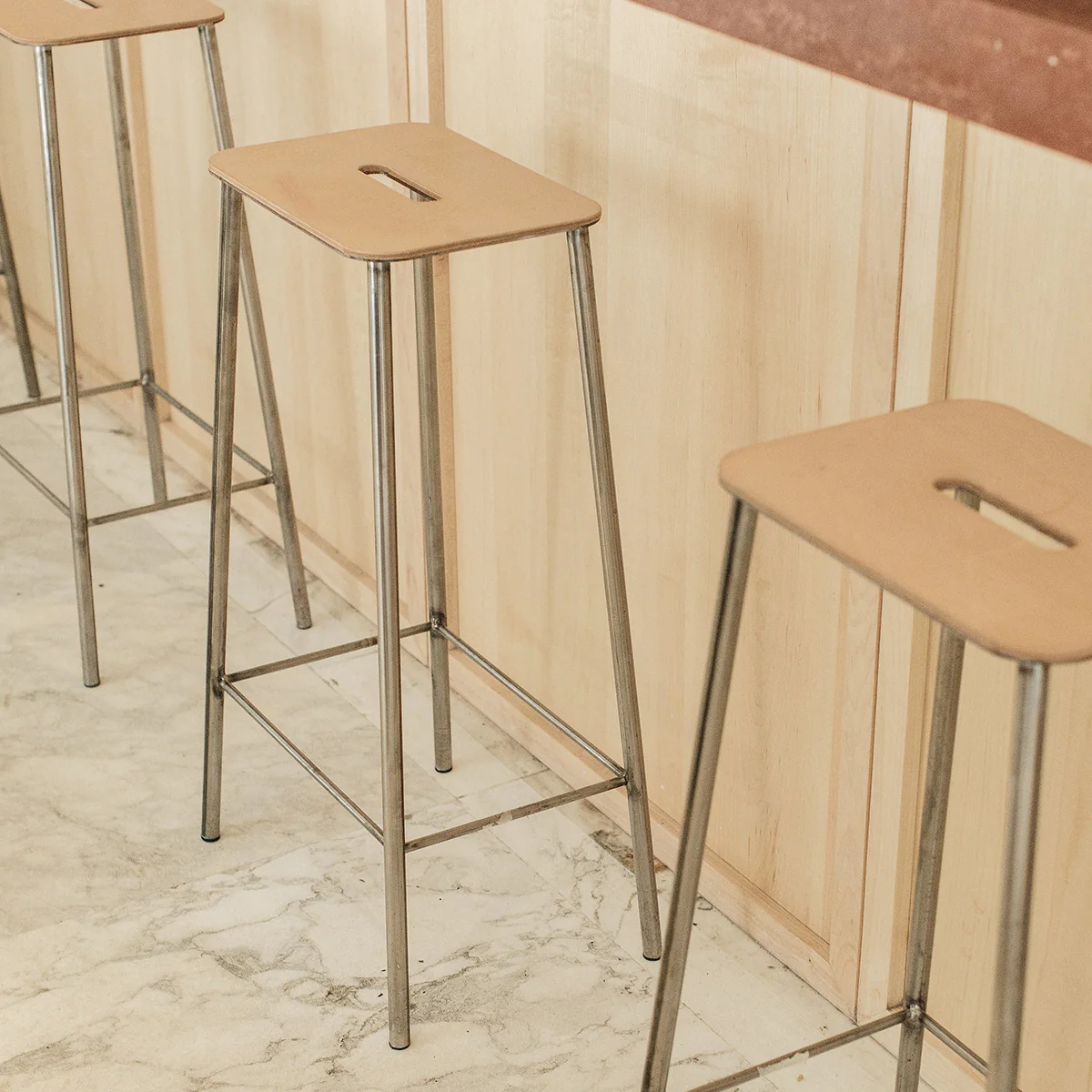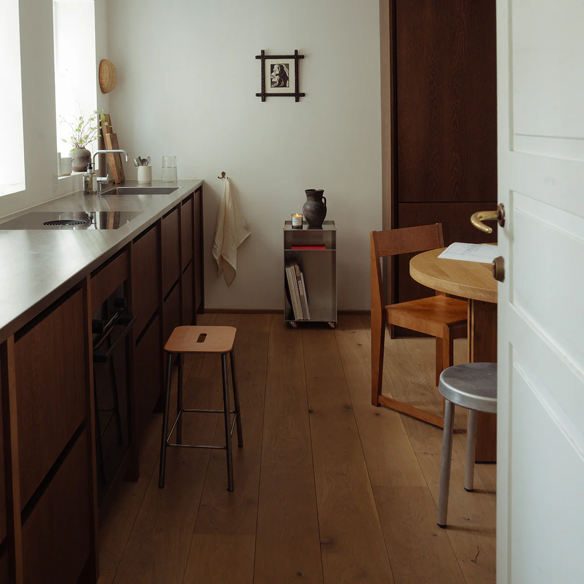 The Adam stool collection from Frama is inspired by industrial design, an artist’s studio, and a workshop. The functionality and simplicity of the design, combined with strong materials, gives this stool a structural and utilitarian approach. The hole in the seat makes it easy and practical to move the stool around.