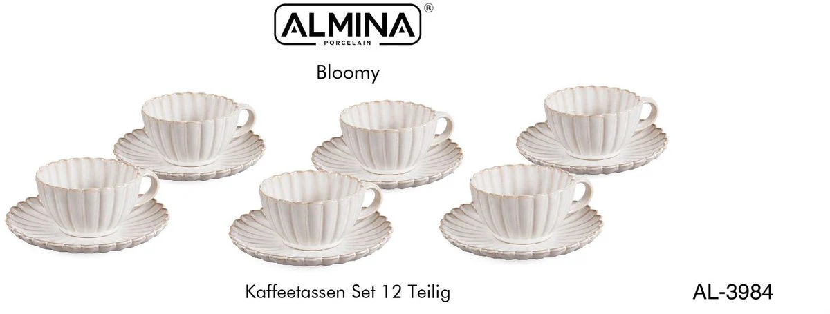Geniet van je koffiemoment in stijl met de Bloomy koffieset. Deze 12-delige set bestaat uit 6 elegante koffiekopjes met bijpassende schotels, vervaardigd uit hoogwaardig porselein in een zachte witte tint. Het verfijnde reliëfdesign en de bloemvormige details geven deze set een klassieke, romantische uitstraling – perfect voor een ontspannen ochtend of een sfeervolle koffietafel met gasten.