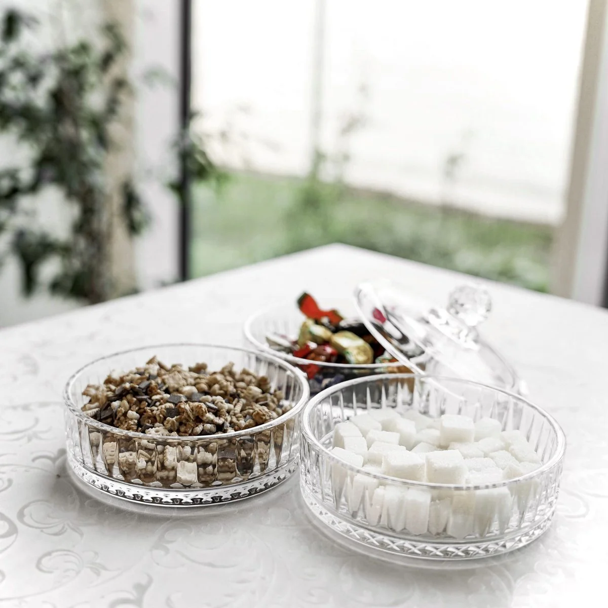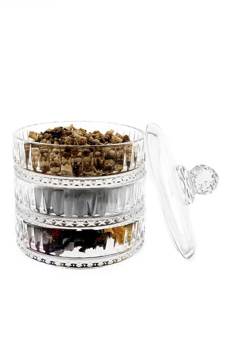 Deze elegante 3-laagse glazen bonbonnière van Almina Elisa is een ware eyecatcher in elk interieur. Perfect voor het stijlvol presenteren van snoepjes, koekjes, noten of andere lekkernijen, maar ook ideaal voor het opbergen van kleine accessoires in de badkamer of op een kaptafel. Dankzij het transparante glas zie je in één oogopslag wat erin zit, terwijl het stevige deksel de inhoud vers houdt. Een multifunctioneel pronkstuk dat klassieke charme combineert met moderne functionaliteit.