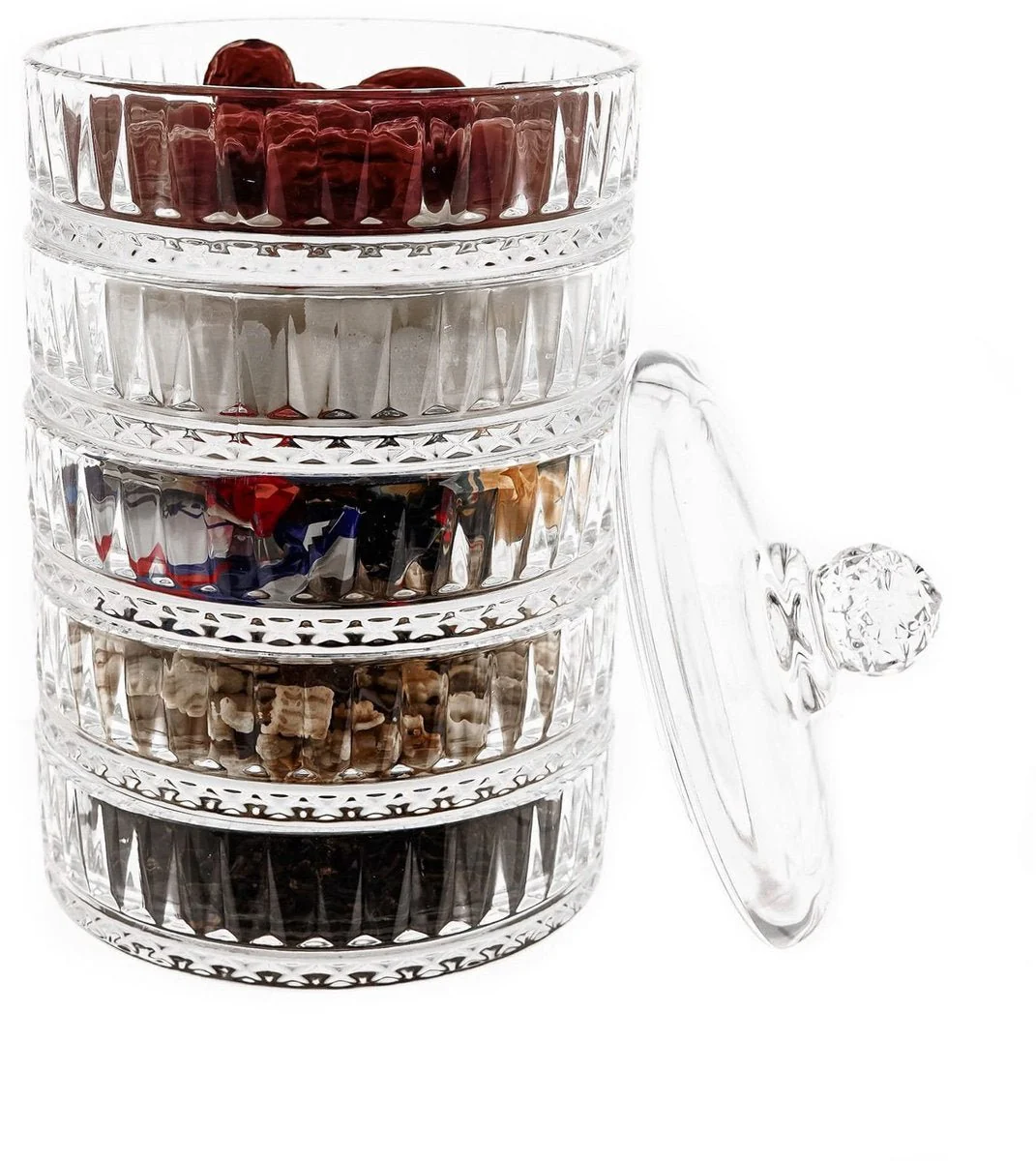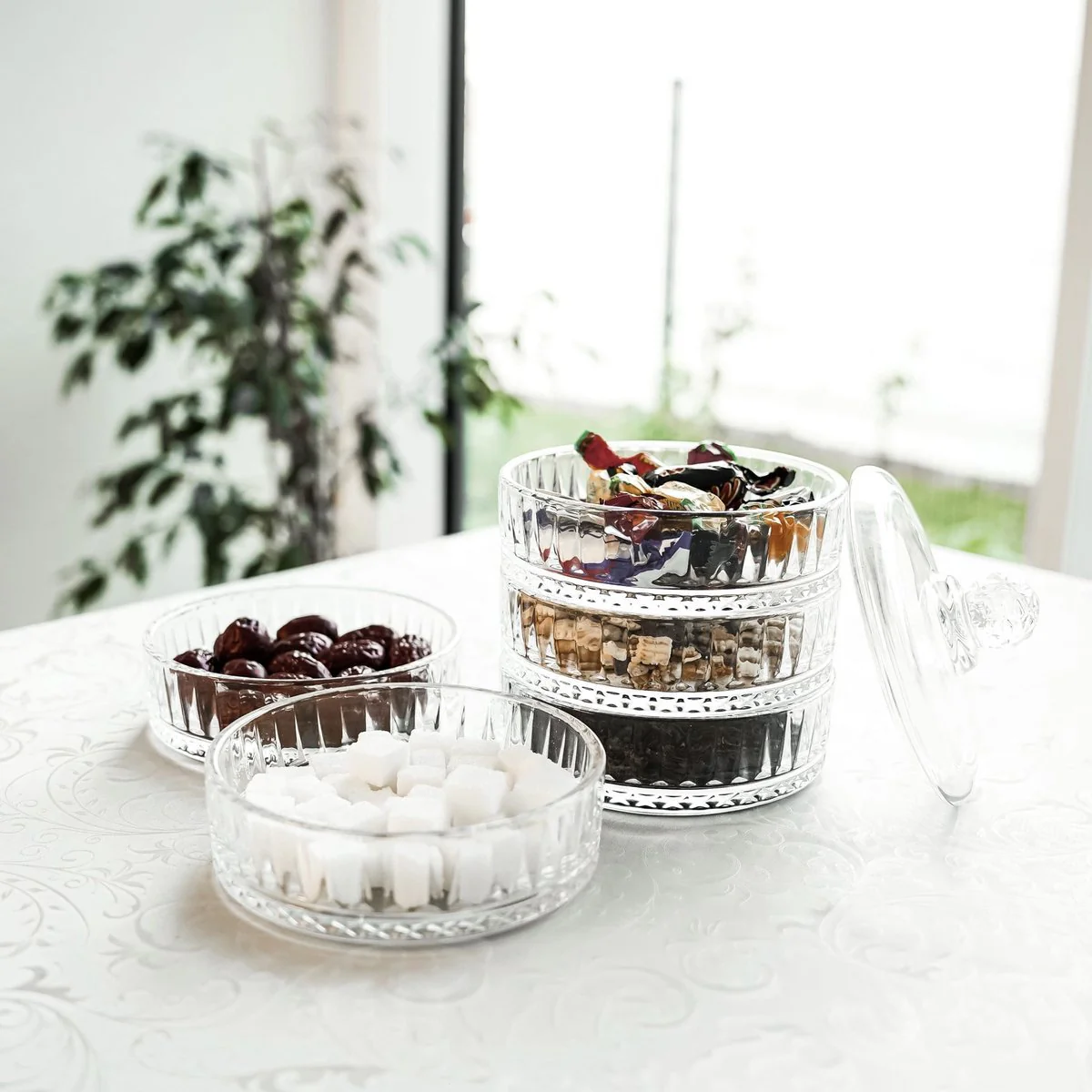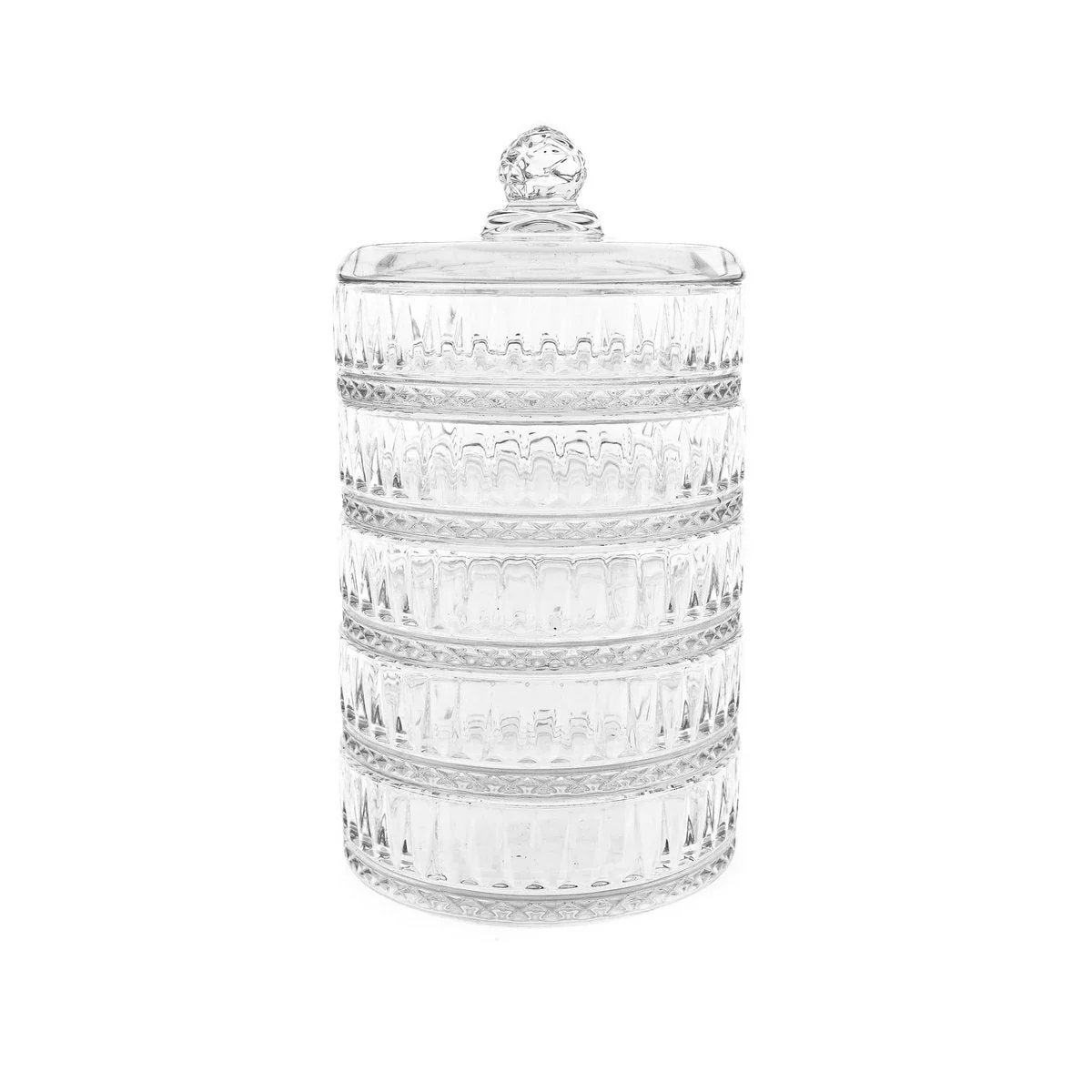Geef je lekkernijen een stijlvolle plek met de Almina Elisa bonbonnière – een elegante 5-laagse glazen voorraadpot met deksel. Dankzij het slimme, stapelbare ontwerp bespaar je ruimte zonder in te leveren op uitstraling. Het verfijnde riffelpatroon geeft de pot een moderne en luxe uitstraling, ideaal voor het presenteren van snoep, koekjes, noten of kleine desserts op tafel of in de keuken.
