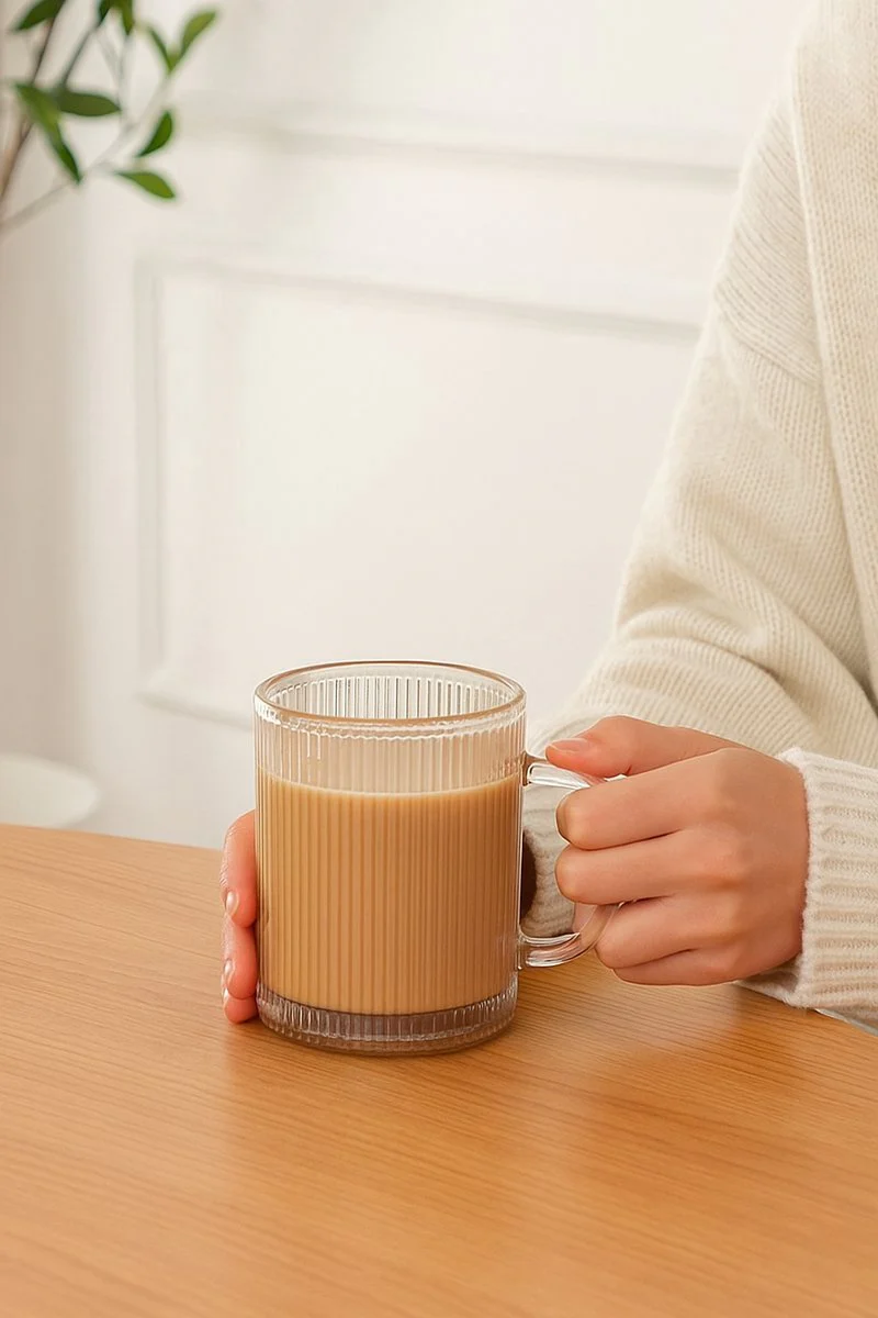 - Vorm: Ronde glazen met verticale ribbels en handig oortje