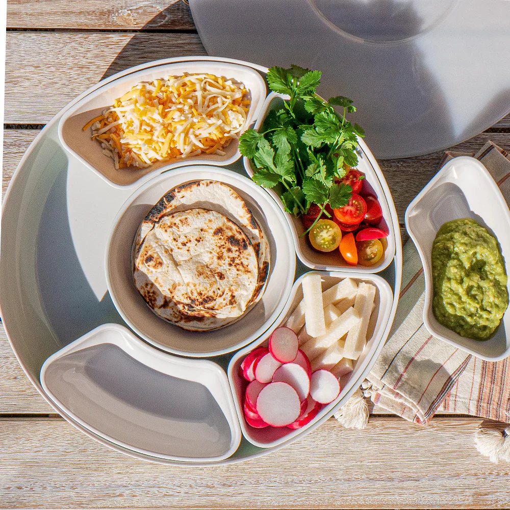De zes compartimentkommen zijn perfect voor nootjes, dips, gesneden groenten, olijven of andere lekkernijen. Alles staat overzichtelijk gepresenteerd op de draaibare Lazy Susan basis — zo kan iedereen makkelijk bij zijn favoriete hapje, zonder schuiven of knoeien.
