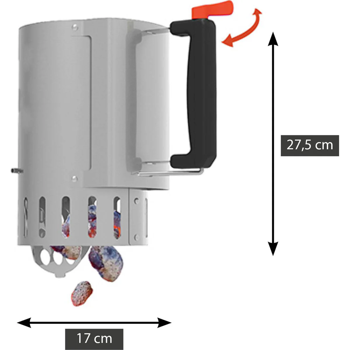 Bij een normale brikettenstarter ben je genoodzaakt de bbq starter om te draaien om de brandende de kolen in de barbecue te werpen. Het gevolg zijn opspattende vonken met mogelijk brandgevaar, of nog vervelender, brandwonden als gevolg.