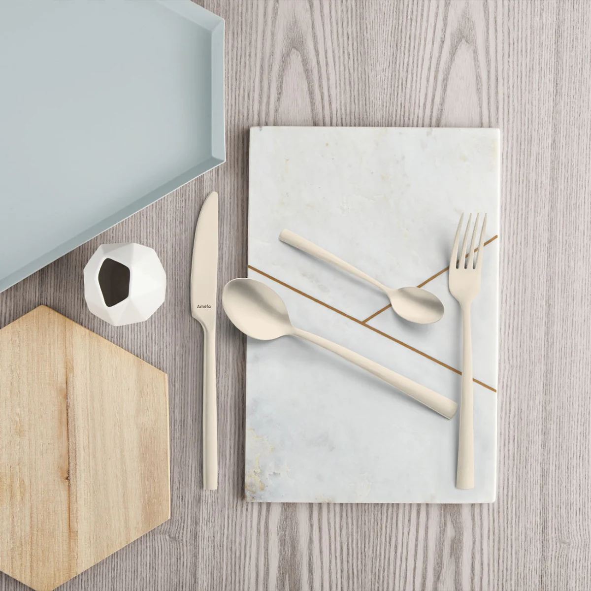 Een stijlvol elegant én lichtgewicht bestek. Het perfecte bestek dus om ook in de camper of caravan te kiezen voor de gezelligheid van een mooi gedekte tafel! Het Manille bestek van Amefa heeft met zijn slanke en platte handvatten een strakke en moderne uitstraling. De gekleurde stonewash afwerking zorgt ervoor dat je het kan combineren met verschillende stijlen en materialen.