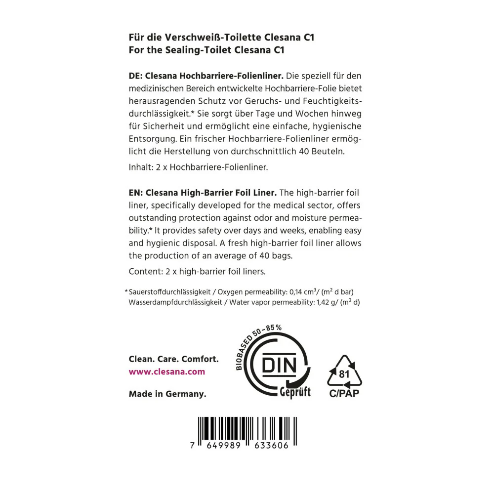 De Clesana BIO Barrier Film Liner is een hoogwaardige, DIN-gecertificeerde biologische folie. Gemaakt van biomassa en gerecyclede materialen, biedt deze folie een uitzonderlijk hoge barrière tegen geur- en vochtdoorlatendheid.