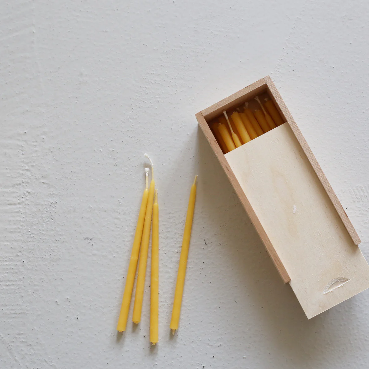Cute birthday cake candles in pure beeswax, natural and subtle honey scented. These candles are packed per 25 pieces in a wooden box.
