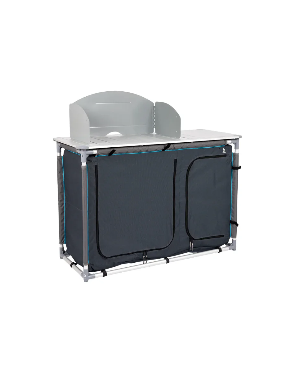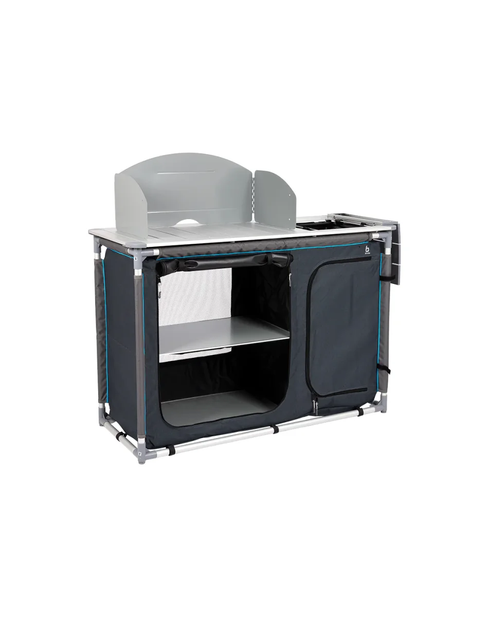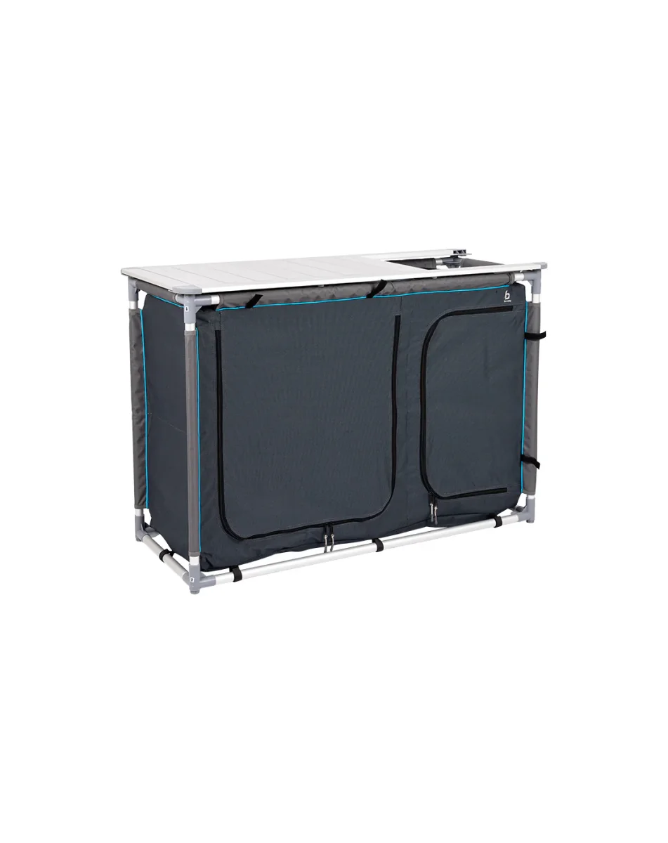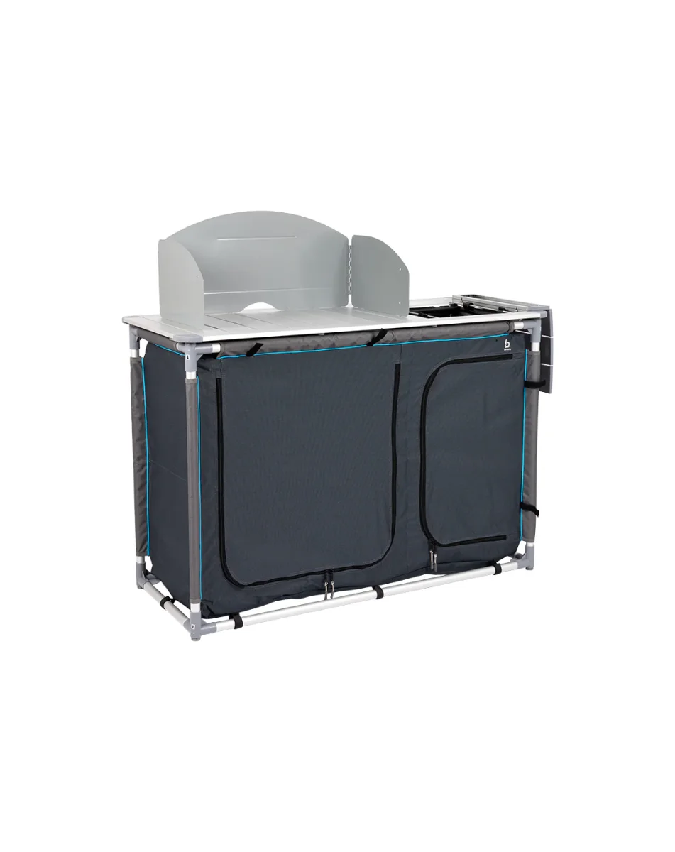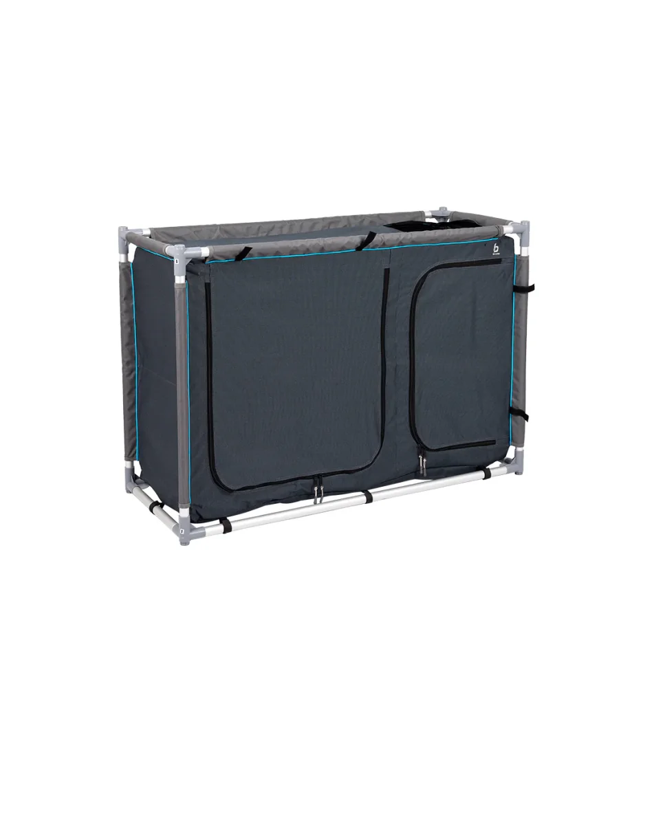Koken op de camping wordt comfortabel én stijlvol met dit zeer luxe kookeiland met geïntegreerde wasbak. Dit complete kookmeubel is voorzien van een extra stevige 600D polyester hoes met daarin 2 ruime legplanken en een vloeropening voor een gasfles – ideaal voor een 4-pits gaskomfoor.