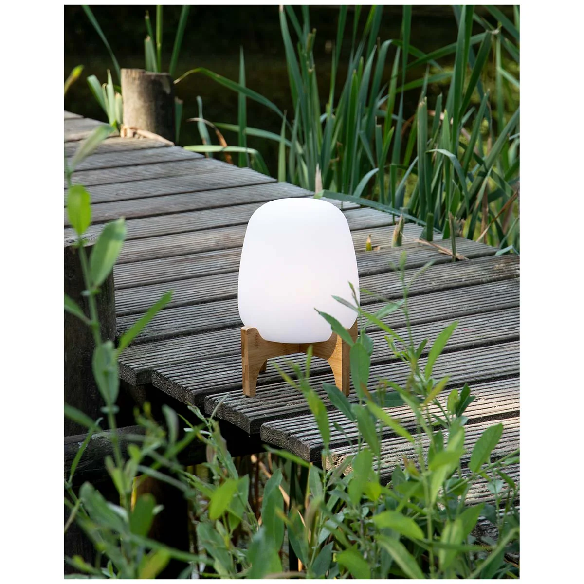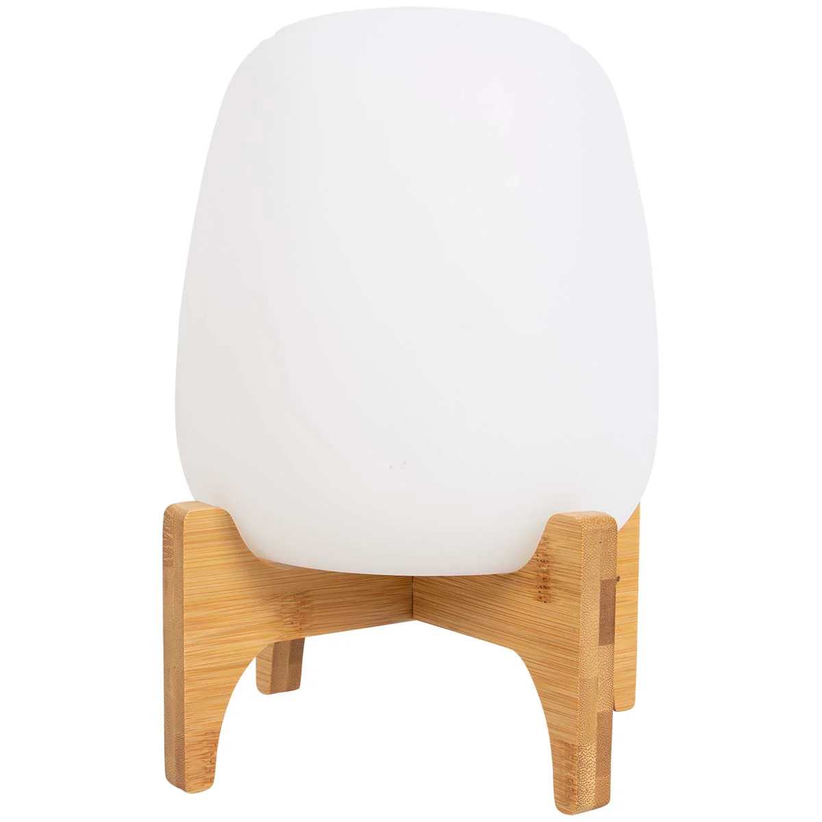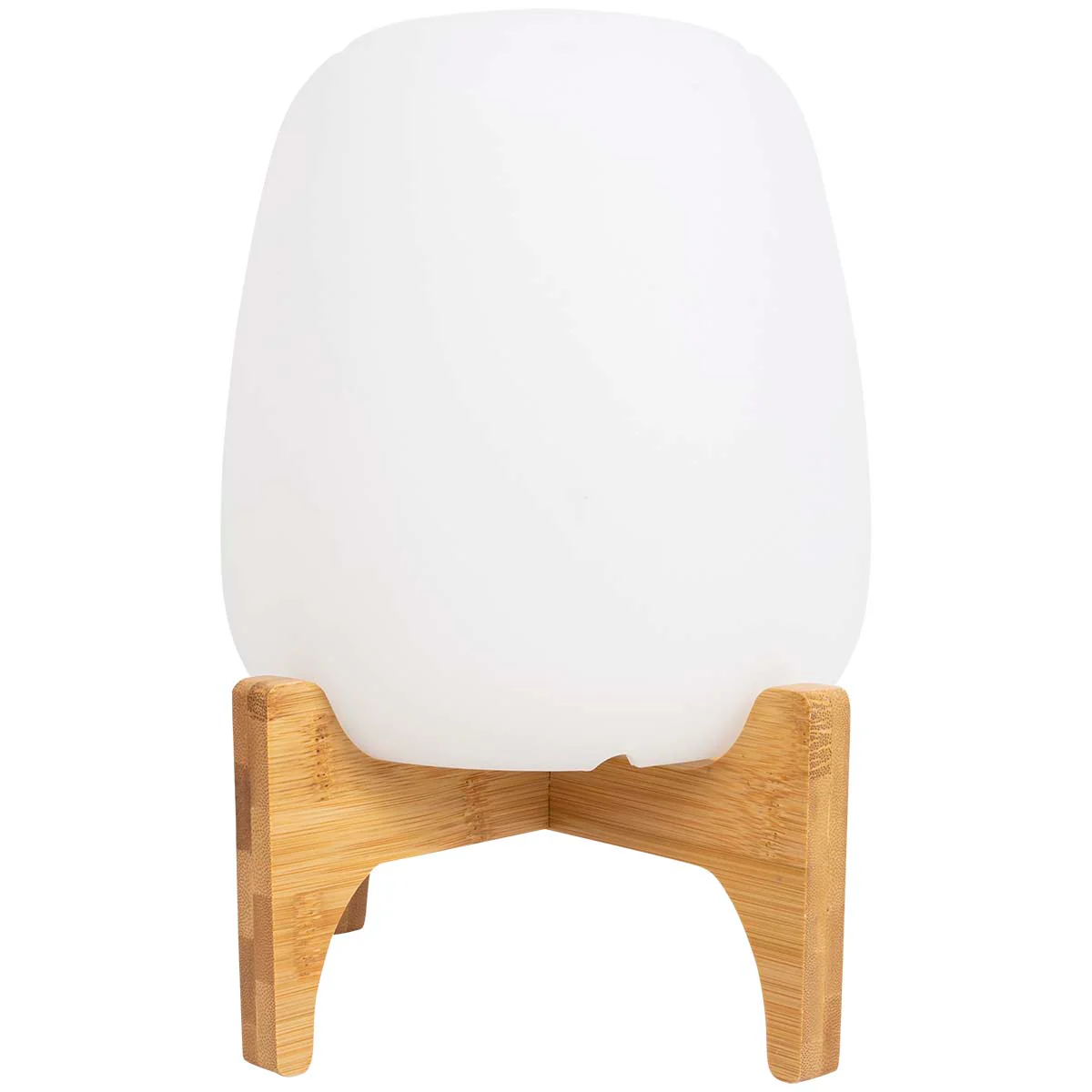 Deze trendy tafellamp op een los bamboe voetstuk is een echte blikvanger voor op tafel of een kastje. De witte matte kap in combinatie met warme LED-verlichting zorgt voor een gezellige sfeer, waar je ook bent.