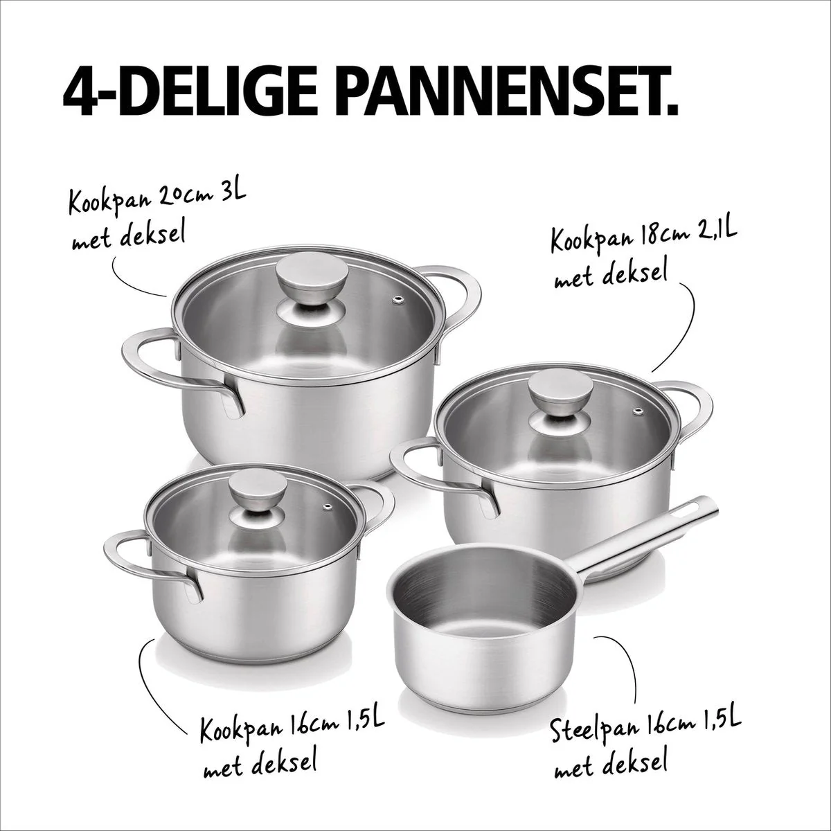 - Kookpannen: 16 cm, 18 cm en 20 cm