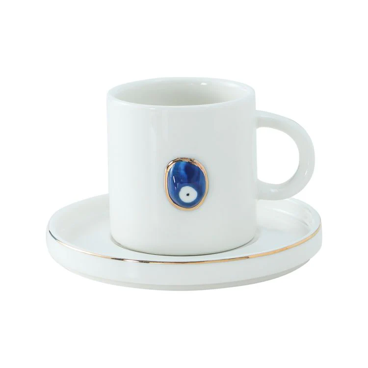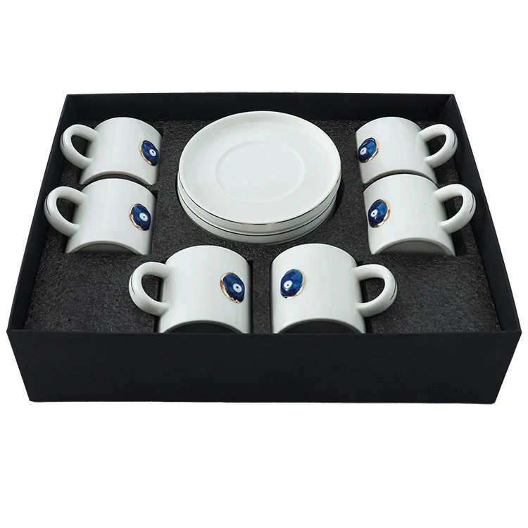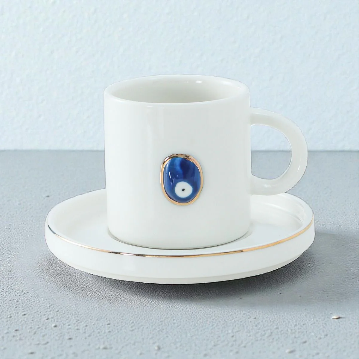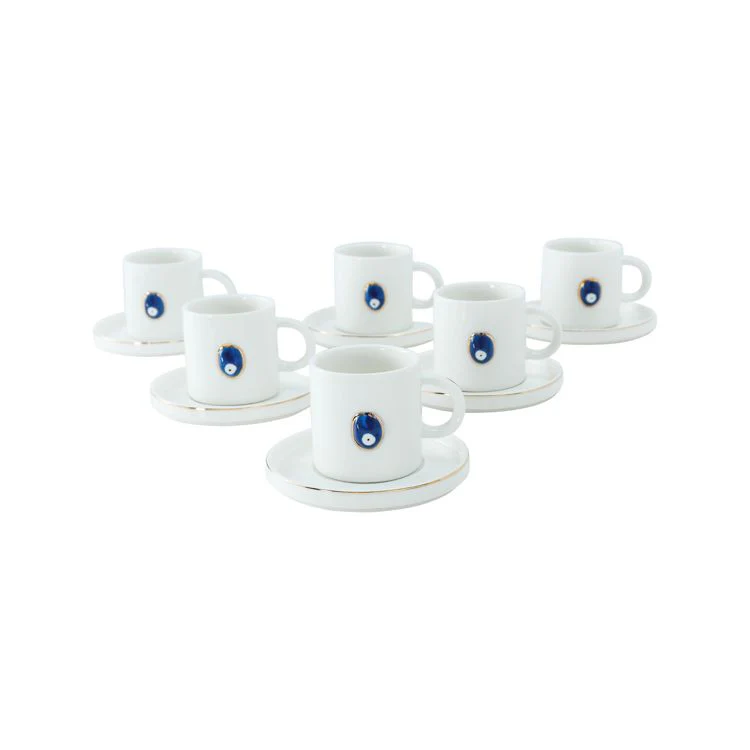 De Bricard Hatira Espressoset Wit-Goud combineert luxe, symboliek en professionele kwaliteit in één stijlvolle set. Deze 12-delige espressoset is vervaardigd van hoogwaardig keramiek en uitgevoerd in elegant wit met verfijnde gouden accenten. Elk kopje is verrijkt met een nazar boncuk (blauwe oog), een traditioneel symbool dat staat voor bescherming en geluk. Dit bijzondere detail geeft de set een unieke uitstraling en maakt elk koffiemoment extra betekenisvol. Ideaal voor intensief gebruik in horeca en catering, maar ook perfect voor een stijlvolle espresso thuis.