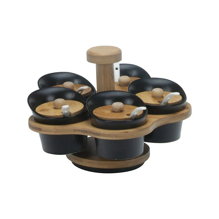 - Materiaal: Keramiek (kommen) en bamboe (deksels, houder, lepels)