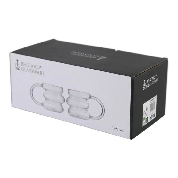 Breng een vleugje elegantie en speelsheid aan tafel met de Bricard Marbella glazen met oor. Deze set van twee curvy drinkglazen valt direct op door het golvende design en de stijlvolle afwerking. Dankzij het stevige oor liggen de glazen comfortabel in de hand en geniet je extra gemakkelijk van warme of koude dranken. Of je nu een latte serveert, een thee of een frisse cocktail – deze glazen geven ieder moment een luxe uitstraling. Met hun 290 ml inhoud zijn ze perfect voor dagelijks gebruik én voor bijzondere gelegenheden.