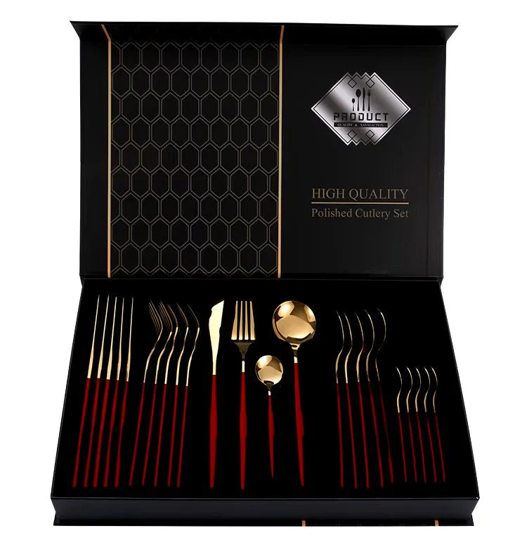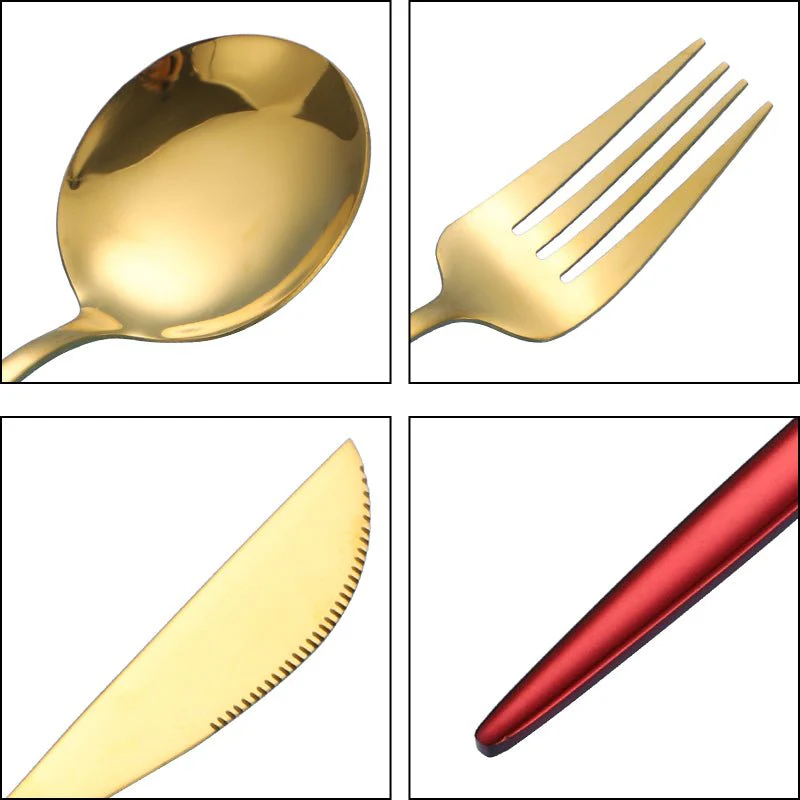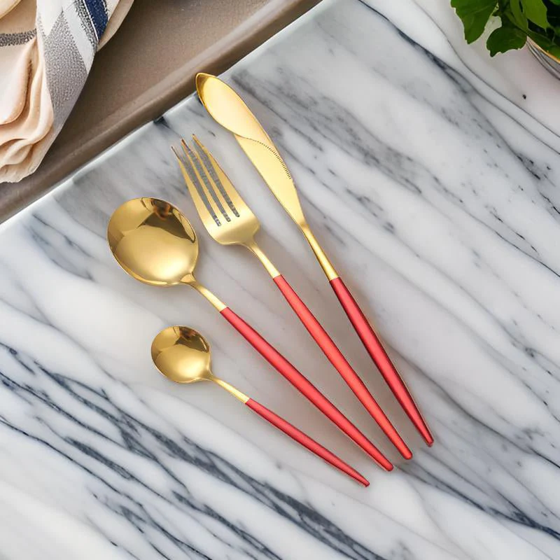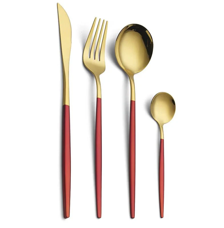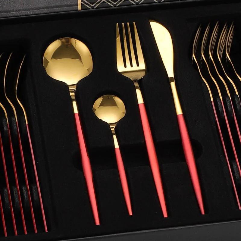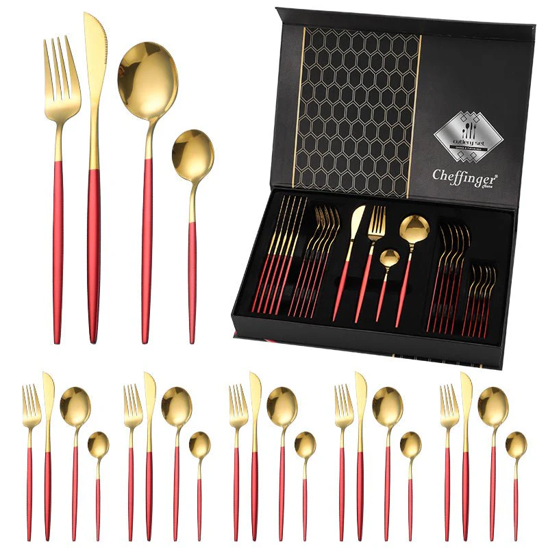 Geef je eettafel een koninklijke uitstraling met de Cheffinger Luxe Bestekset – een elegante 24-delige set voor 6 personen die een warme, stijlvolle sfeer toevoegt aan elke maaltijd. Het klassieke rode design in combinatie met de luxueuze gouden afwerking maakt van dit bestek een echte eyecatcher. Of je nu dagelijks dineert of een feestelijk diner organiseert, deze set brengt een vleugje verfijning naar elk moment. Het hoogwaardige roestvrij staal zorgt voor duurzaamheid en jarenlang gebruiksgemak.
