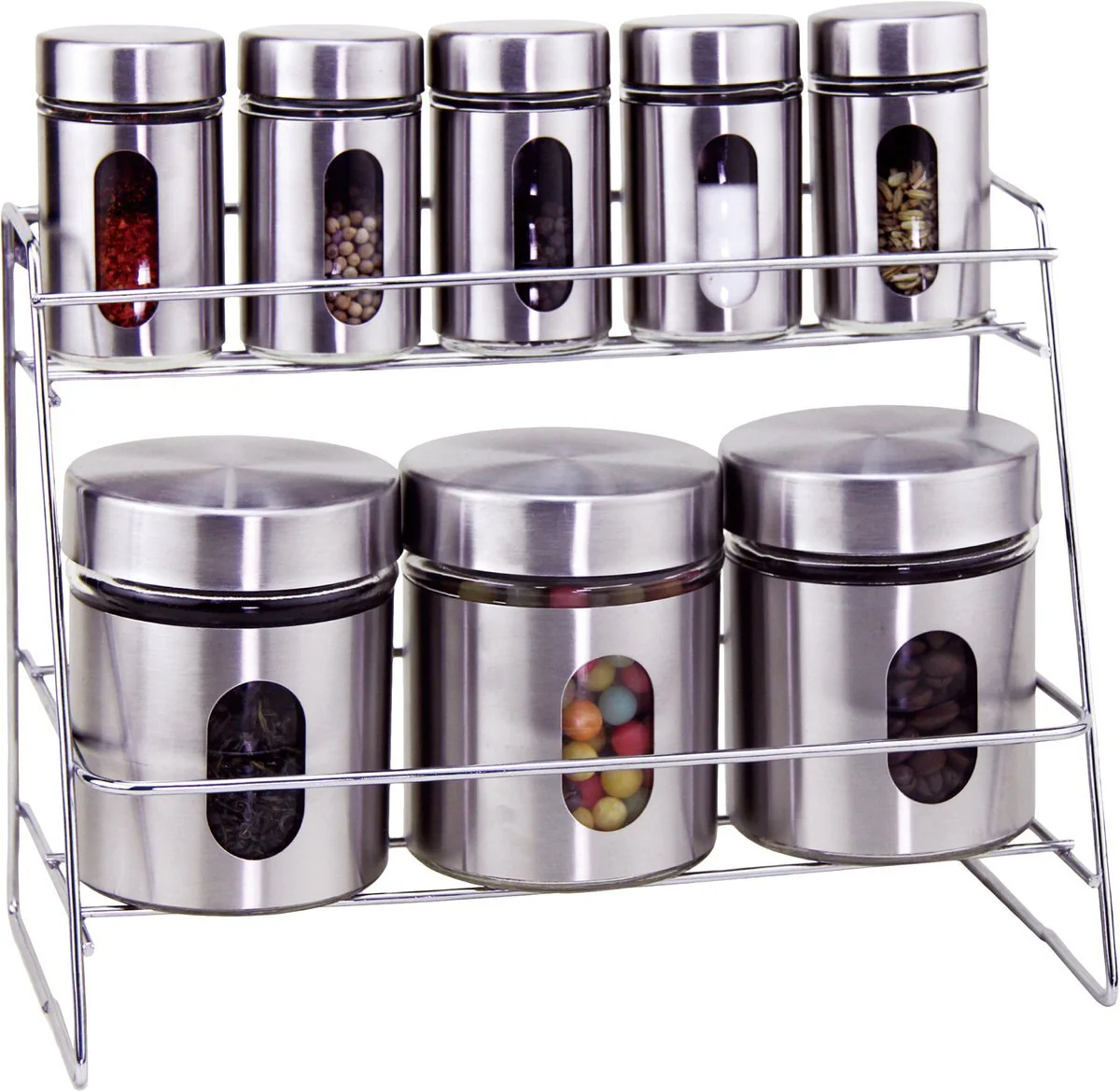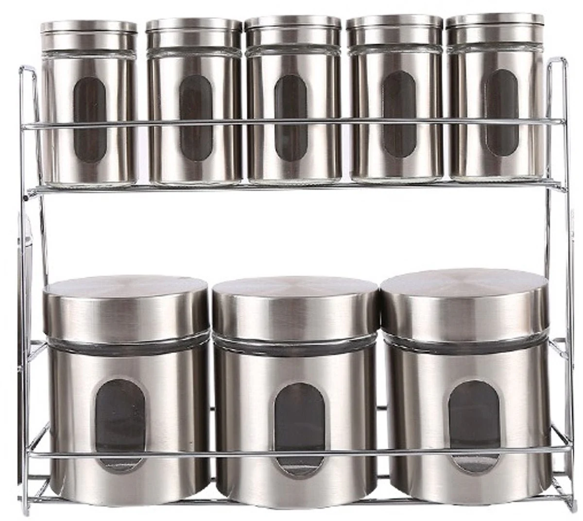 Breng orde en stijl in je keuken met dit 8-delige kruiden- en voorraadset! De combinatie van vijf compacte kruidenpotjes en drie grotere bewaardozen biedt je volop ruimte om kruiden, specerijen en andere levensmiddelen netjes en overzichtelijk op te bergen. Dankzij de robuuste standaard van roestvrij staal en de praktische strooifunctie heb je alles binnen handbereik en blijft je werkruimte altijd georganiseerd.