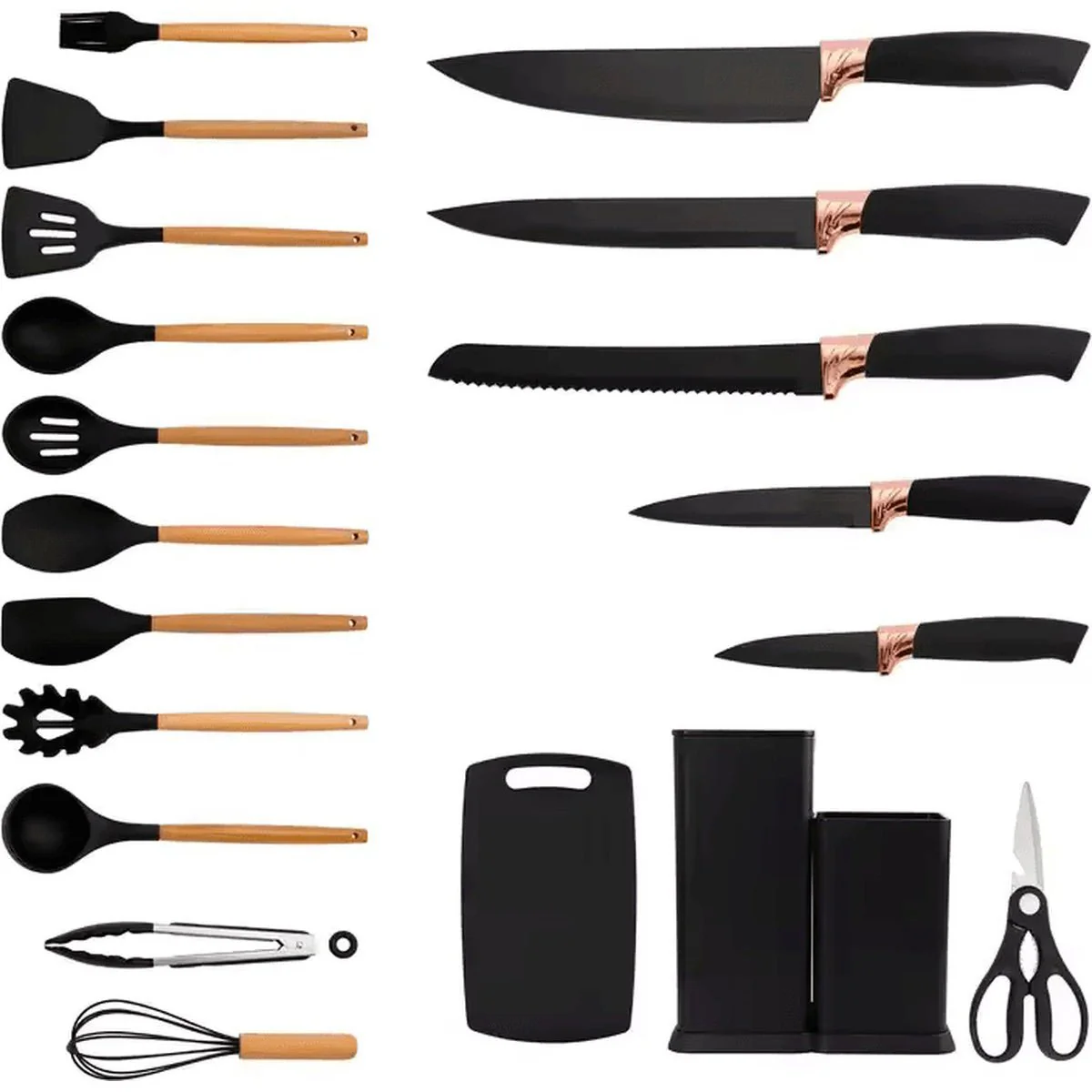 Til je kookervaring naar een hoger niveau met de 19-delige messenset & keukengerei set met siliconen handgrepen – zwart. Deze complete set biedt alles wat je nodig hebt om met gemak, precisie en stijl te koken. Of je nu snijdt, roert of serveert, elk onderdeel is ontworpen voor comfort, hygiëne en duurzaamheid – ideaal voor zowel de beginnende als de ervaren kok.