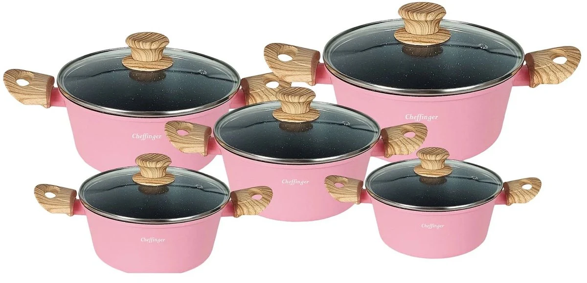 Breng kleur en karakter in je keuken met de Cheffinger 10-delige pannenset in roze. Deze opvallende en stijlvolle set is niet alleen een echte blikvanger, maar ook ontworpen voor optimaal kookgemak. De combinatie van de roze buitenkant, houtlook handgrepen en glazen deksels geeft je keuken een speelse en moderne uitstraling. Dankzij de duurzame marmeren coating en inductiegeschiktheid is deze pannenset zowel praktisch als elegant.
