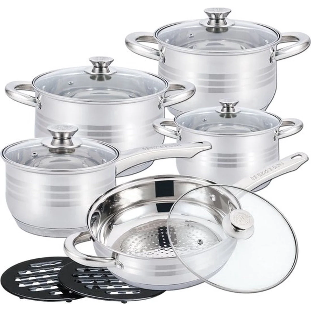 Duurzaam en veelzijdig – het 18/10 RVS is bestand tegen vervorming en blijft mooi, maaltijd na maaltijd. De antiaanbaklaag voorkomt dat voedsel aanbrandt en maakt schoonmaken eenvoudig, terwijl de set ook vaatwasmachinebestendig is voor extra gemak. Het elegante, gepolijste design voegt een moderne touch toe aan elke keuken.