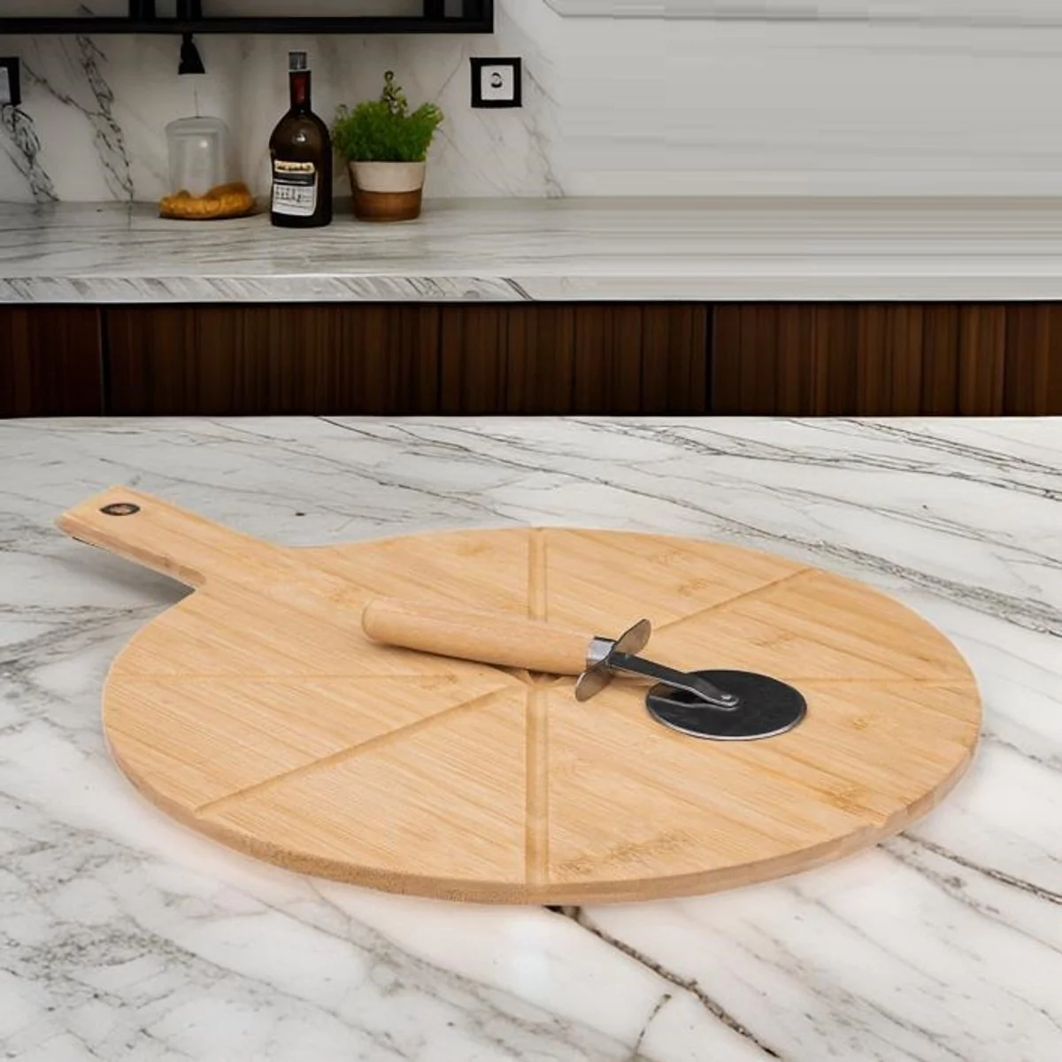 Geniet van perfecte pizza-avonden met deze stijlvolle 2-delige bamboe pizzaset – onmisbaar voor elke pizzaliefhebber. Of je nu gaat voor een klassieke Margherita of een pittige Salami: met het stevige pizzabord van bamboe en de zes ingefreesde snijgleuven verdeel je je pizza altijd in gelijke stukken. De scherpe pizzasnijder van roestvrij staal maakt het snijden eenvoudig en soepel. Dankzij het handvat is het bord gemakkelijk te dragen én mooi te presenteren – ideaal voor feestjes, gezellige avonden of als origineel cadeau.
