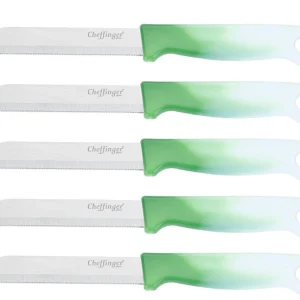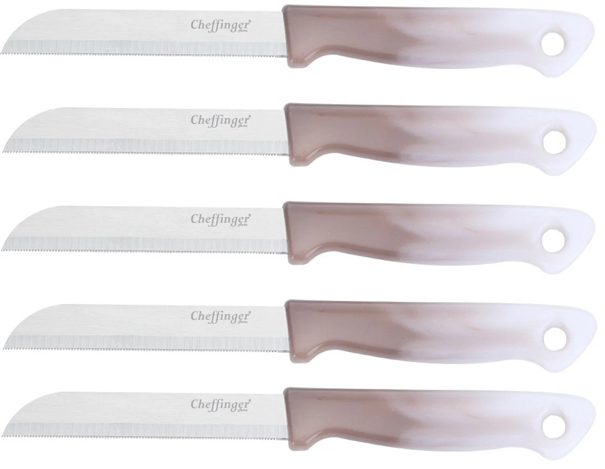 Voeg stijl en gebruiksgemak toe aan je keuken met de Cheffinger schilmessenset – 5 stuks in bruin. Deze set bevat vijf identieke schilmessen met een totale lengte van 18 cm, perfect voor het schillen en snijden van groenten, fruit en andere kleine ingrediënten. De vlijmscherpe roestvrijstalen lemmeten met gladde snede zorgen voor moeiteloos en nauwkeurig snijwerk, terwijl de bruine handgrepen zorgen voor een klassieke en elegante uitstraling, gecombineerd met comfortabele grip.