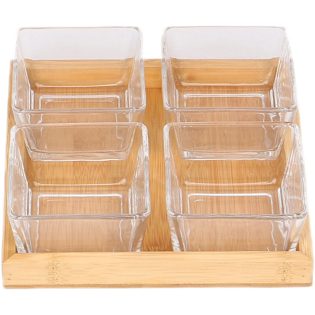 Breng stijl en overzicht op tafel met dit 5-delige bamboe snackschalen set. De vier elegante glazen kommetjes zijn perfect voor het serveren van noten, snoep, fruit of kleine hapjes en staan stevig in het bijpassende bamboe dienblad. Dankzij het strakke, vierkante design en de natuurlijke materialen is dit serveerset een echte blikvanger – ideaal voor feestjes, borrels of gewoon een gezellige avond thuis. De schaaltjes zijn uitneembaar en makkelijk te reinigen, wat dit setje net zo praktisch maakt als het mooi is.