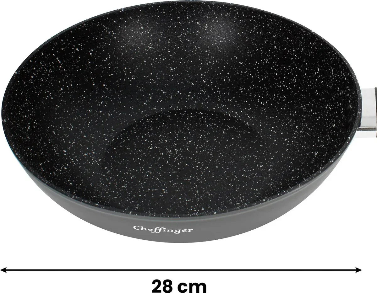 Ervaar koken op professioneel niveau met de Cheffinger Wokpan met Deksel – 28 cm – Geschikt voor Inductie. Deze hoogwaardige wokpan uit de Cheffinger Collection is speciaal ontworpen voor wie houdt van smaakvol, gezond en efficiënt koken. Dankzij de duurzame marmercoating en zwartsteen anti-aanbaklaag bereid je al je wokgerechten vetarm, zonder dat ingrediënten aan de bodem kleven.