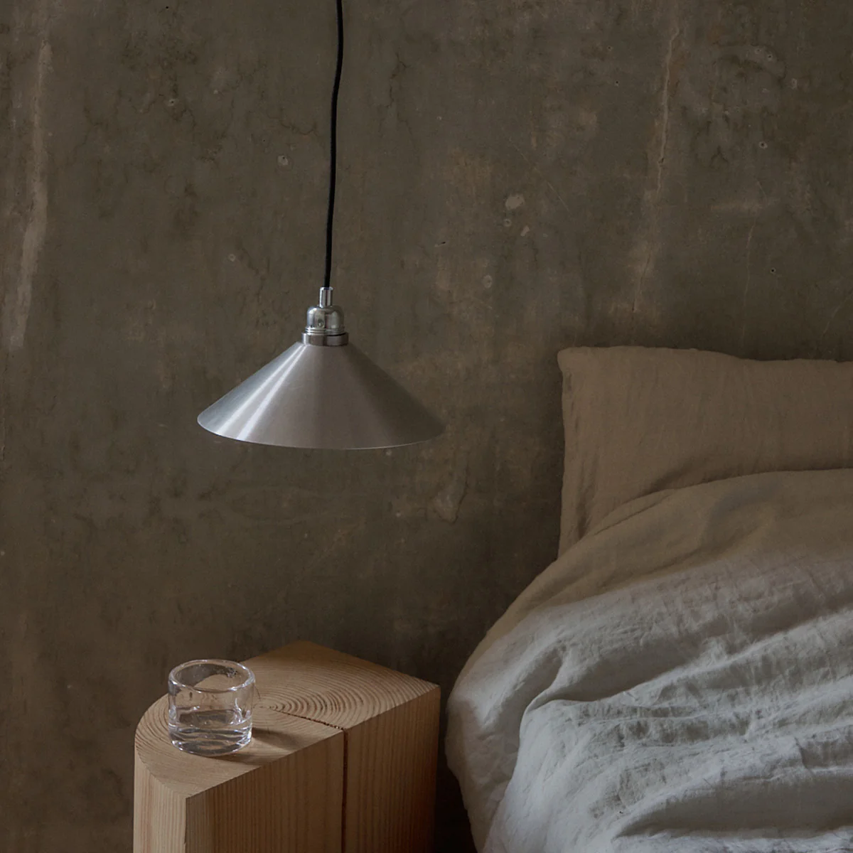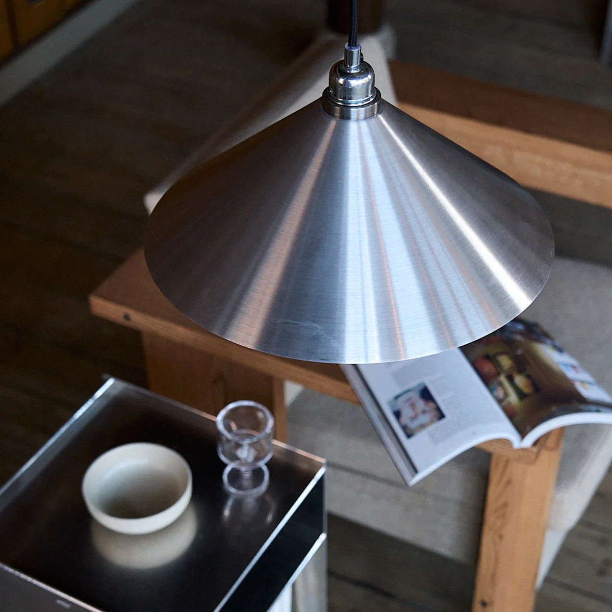 The cone shade lamp is the first in a series of geometric shaped lamps by Frama. Inspired by the cone, the solid brass or copper shade provides a strong character while maintaining a simple aesthetic. This beautiful light is perfect for suspending over a dining table or kitchen, elegant and simple. This lamp comes with a matching pendant and black cord.
