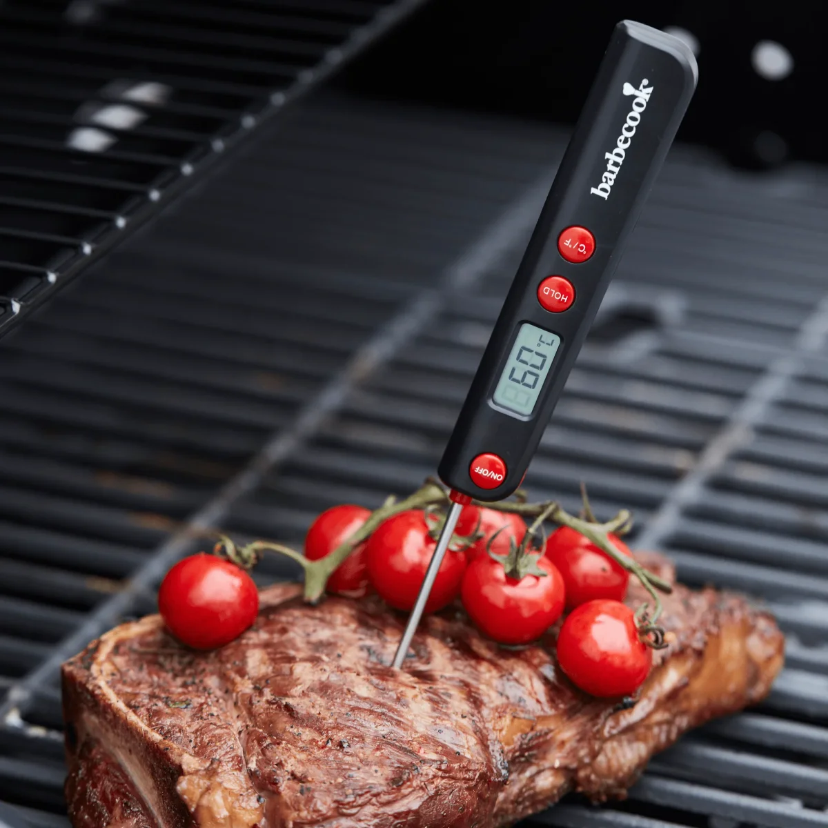 Deze handige digitale vleesthemometer past dichtgevouwen perfect in je broekzak.