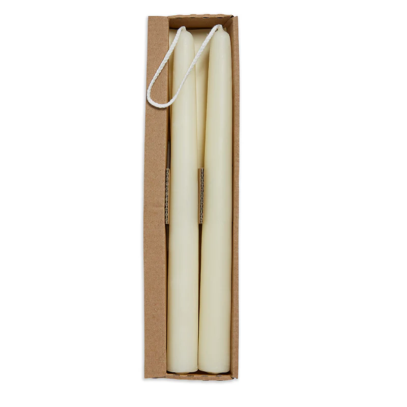 Dipped candles in pure beeswax in white, natural and subtle honey scented. These candles are clean burning for about 12 hours and come in pairs in a recycled cardboard gift box.