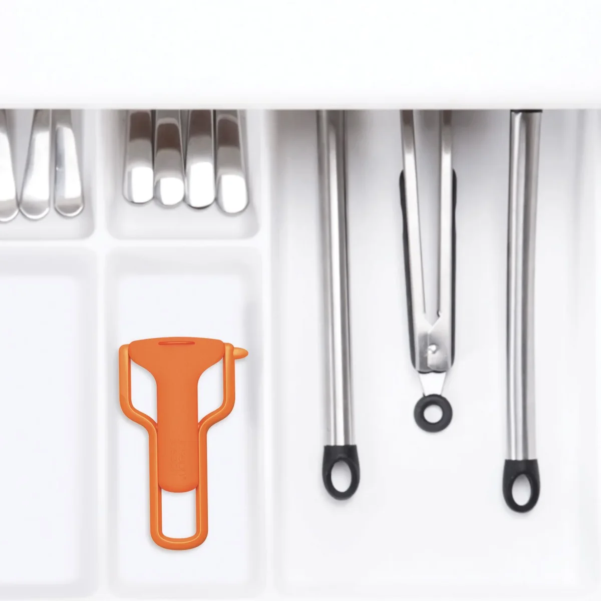 De SafeStore dunschiller van Joseph Joseph is het antwoord op het veilig opbergen van scherpe voorwerpen. Deze innovatieve dunschiller, met zijn unieke ‘Y’ vormig ontwerp, combineert functionaliteit met veiligheid. Het meest kenmerkend is de geïntegreerde mesbescherming in de handgreep, die na gebruik over het scherpe RVS mes geschoven kan worden. Dit zorgt ervoor dat je de dunschiller probleemloos kunt opbergen in je keukenlade, zonder risico op snijwonden of beschadigingen aan andere voorwerpen. Bovendien blijft het mes langer scherp. De dunschiller is niet alleen praktisch in gebruik dankzij de scherpte en duurzaamheid van het mes, maar biedt ook extra gemak met een ingebouwde tool voor het verwijderen van aardappelogen. Beschikbaar in zowel een gladde als een julienne variant, is deze dunschiller een must-have voor elke keuken, waarbij veiligheid en efficiëntie hoog in het vaandel staan.