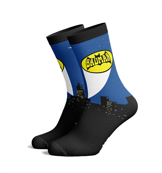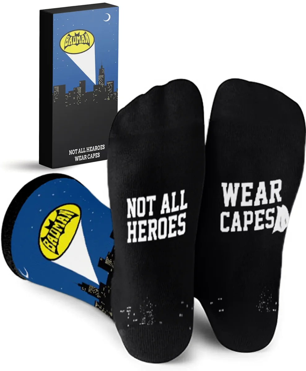 Grappig en Uniek Design: Het stijlvolle “Badman” ontwerp en de tekst “Not all heroes wear capes” maken deze sokken een geweldige toevoeging aan elke sokkenlade.