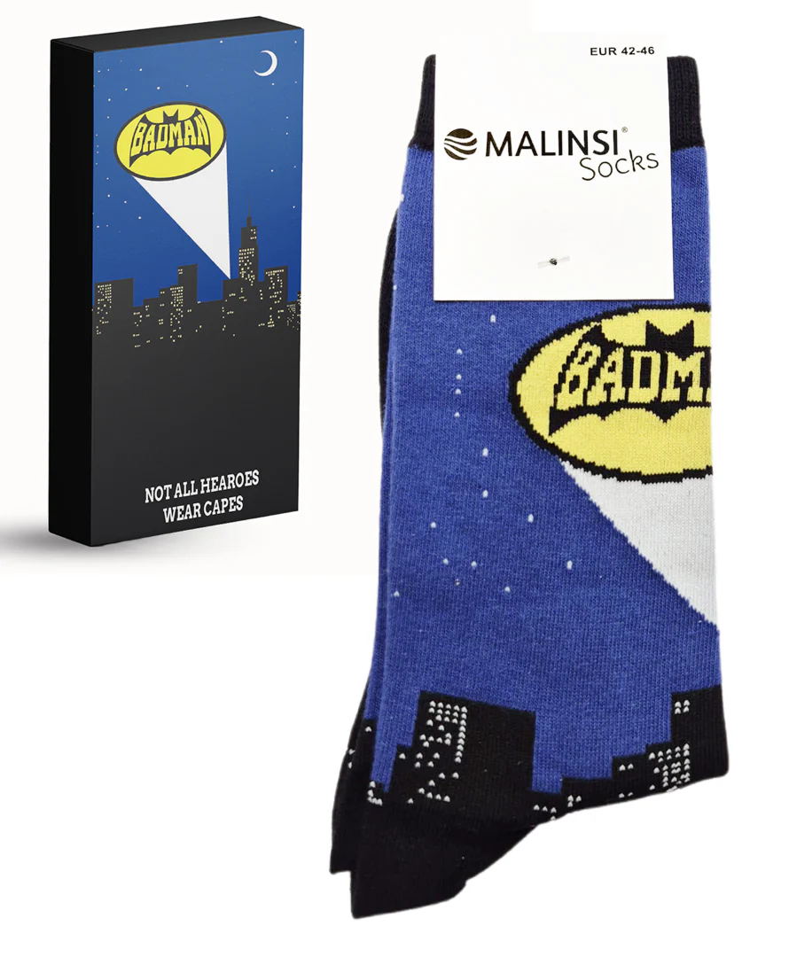 Deze grappige en stijlvolle sokken hebben een uniek design, compleet met een nachtblauwe achtergrond, een stadssilhouet en het opvallende “Badman” logo. Perfect voor iedereen die een held is zonder dat ze het zelf doorhebben! De onderkant van de sokken heeft de speelse spreuk “Not all heroes wear capes”, die zichtbaar wordt wanneer je je voeten omhoog legt. Een subtiele, humoristische herinnering dat heldendom niet altijd gepaard gaat met spectaculaire kostuums. Deze sokken komen verpakt in een uniek thema-verpakking doosje, helemaal in stijl van de sokken zelf. Het doosje maakt het extra speciaal om te geven en zorgt direct voor een glimlach bij het uitpakken. Dankzij deze fraaie verpakking zijn de Malinsi “Badman” Sokken perfect geschikt voor alle cadeaumomenten zoals Sinterklaas, Kerst, een verjaardag, of gewoon om iemand in het zonnetje te zetten.