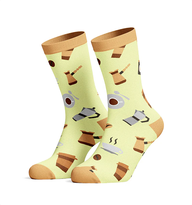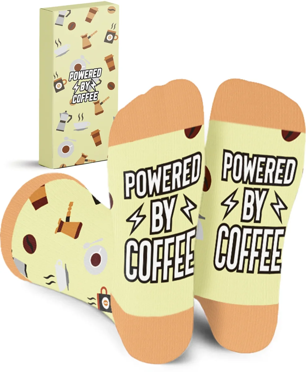 - Grappig en Uniek Design: Het koffie-ontwerp en de tekst “Powered by Coffee” maken deze sokken tot een leuk accessoire voor elke koffieliefhebber.