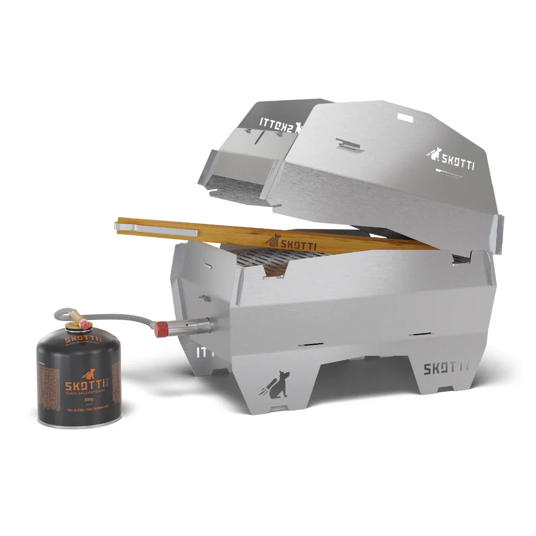 Heb je een kap nodig om te grillen met de SKOTTI Grill? Nee! Maar zou de SKOTTI Cap dan nog steeds het perfecte accessoire voor jou kunnen zijn? Ja! Dit komt omdat de SKOTTI Cap niet alleen een kap is die het grillen op winderige plekken gemakkelijker maakt. Hij kan ook multifunctioneel worden opgezet en gebruikt, afhankelijk van de situatie en het te grillen voedsel: als je twee of drie van de vijf roestvrijstalen onderdelen aan elkaar monteert, kan hij worden omgebouwd tot een eenvoudig windscherm. Je kunt ook een rotisserie bevestigen met slechts drie of alle vier de zijdelen. De SKOTTI Cap is aan de bovenkant gesloten en aan één kant open en kan je SKOTTI Grill omtoveren tot een pizzaoven. Alle vijf onderdelen samen vormen een complete kap. Op deze manier kun je veel recepten bereiden die verder gaan dan het typische grillen van biefstuk of worst, zoals die voor het bereiden van brood, pizza, vis-, vlees- en groentespiesen, maïskolven of grotere stukken die een langere kooktijd vereisen.