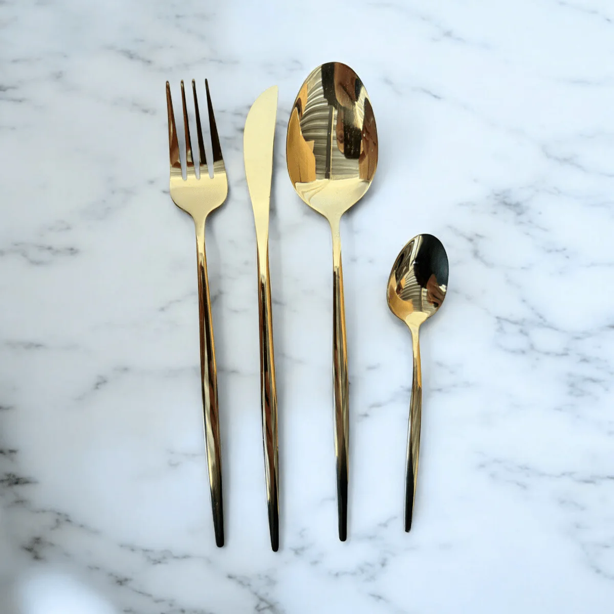 Voeg een vleugje gouden luxe toe aan je eettafel met de Kadirelli 24-delige bestekset. Deze elegante set is de perfecte mix van stijl, comfort en duurzaamheid. De verfijnde gouden afwerking geeft iedere maaltijd een feestelijk karakter, of je nu dineert met familie of gasten ontvangt voor een bijzondere gelegenheid. Met zijn tijdloze design en hoogwaardige afwerking is dit bestek een echte blikvanger op tafel.