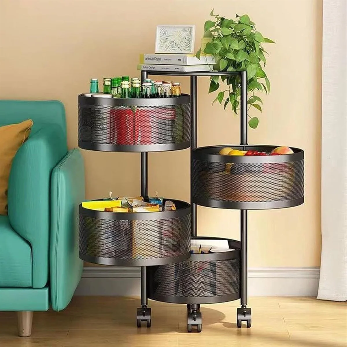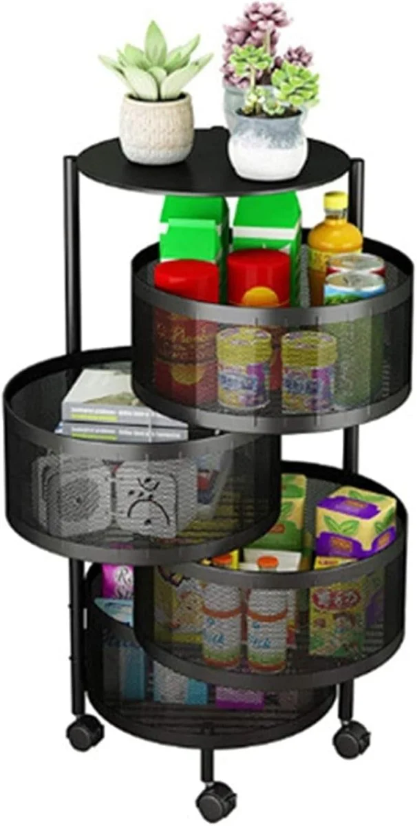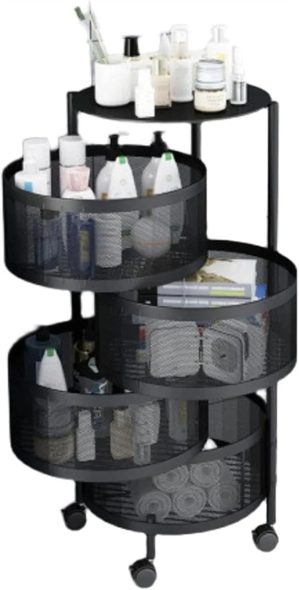 Strak, modern en praktisch – de zwarte Kadirelli Keukentrolley met ronde mandjes tilt je organisatie naar een hoger niveau. De vier lagen met fraai afgeronde mandjes zorgen niet alleen voor een unieke uitstraling, maar ook voor optimale zichtbaarheid en bereikbaarheid van al je spullen. Of je nu kruiden, groente, cosmetica of kantoorspullen opbergt, deze trolley biedt de flexibiliteit die je nodig hebt. Dankzij de wieltjes verplaats je hem moeiteloos door je huis – stijlvol én functioneel.