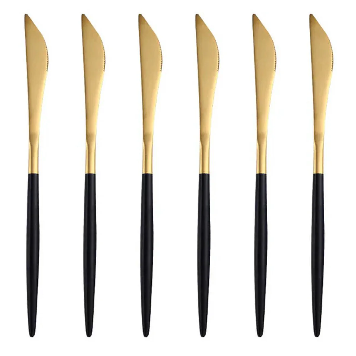 Geef je dinertafel een luxe upgrade met de Kadirelli Tafelmes Set – Set van 12 in goud met zwart. Deze elegante messen tillen elke maaltijd naar een hoger niveau dankzij hun verfijnde design en hoogwaardige afwerking. Het contrast tussen het glanzende gouden lemmet en het diepe zwarte handvat zorgt voor een moderne, stijlvolle uitstraling die direct opvalt.
