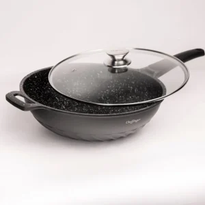 - Vorm: Traditionele ronde wokpan met schuine randen