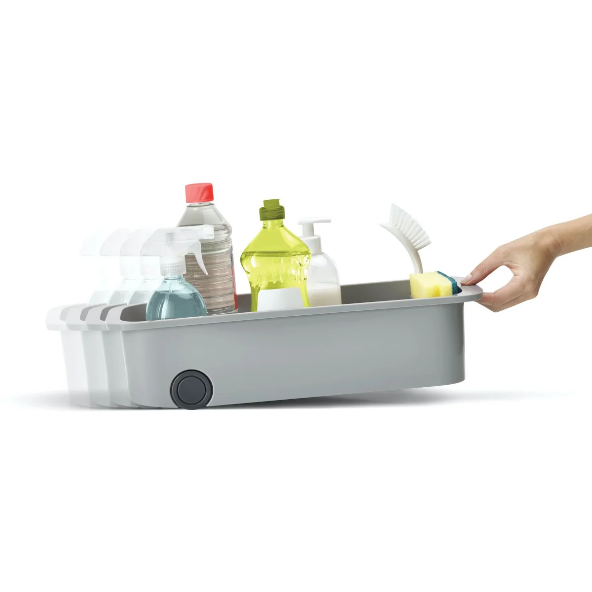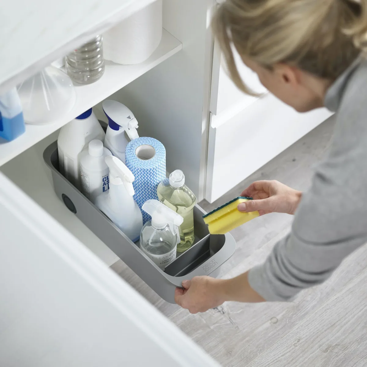 Ontdek het gemak van de Joseph Joseph keukenkast organiser: met wieltjes voor moeiteloze toegang tot zelfs de laagste planken. Perfect voor het ordenen van schoonmaakmiddelen en met een speciaal vakje voor sponzen. Maak elke hoek van je kast praktisch en bereikbaar!