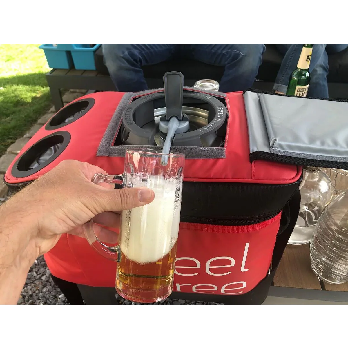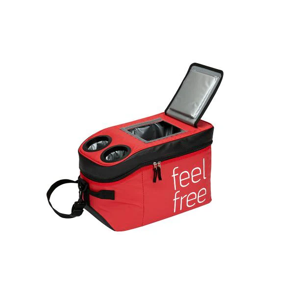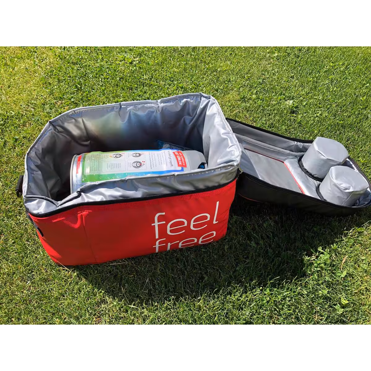 De stijlvolle rode kleur met het Isabella-logo en de tekst “feel free” geeft de tas een herkenbare en sportieve uitstraling die perfect past bij een ontspannen kampeerleven.