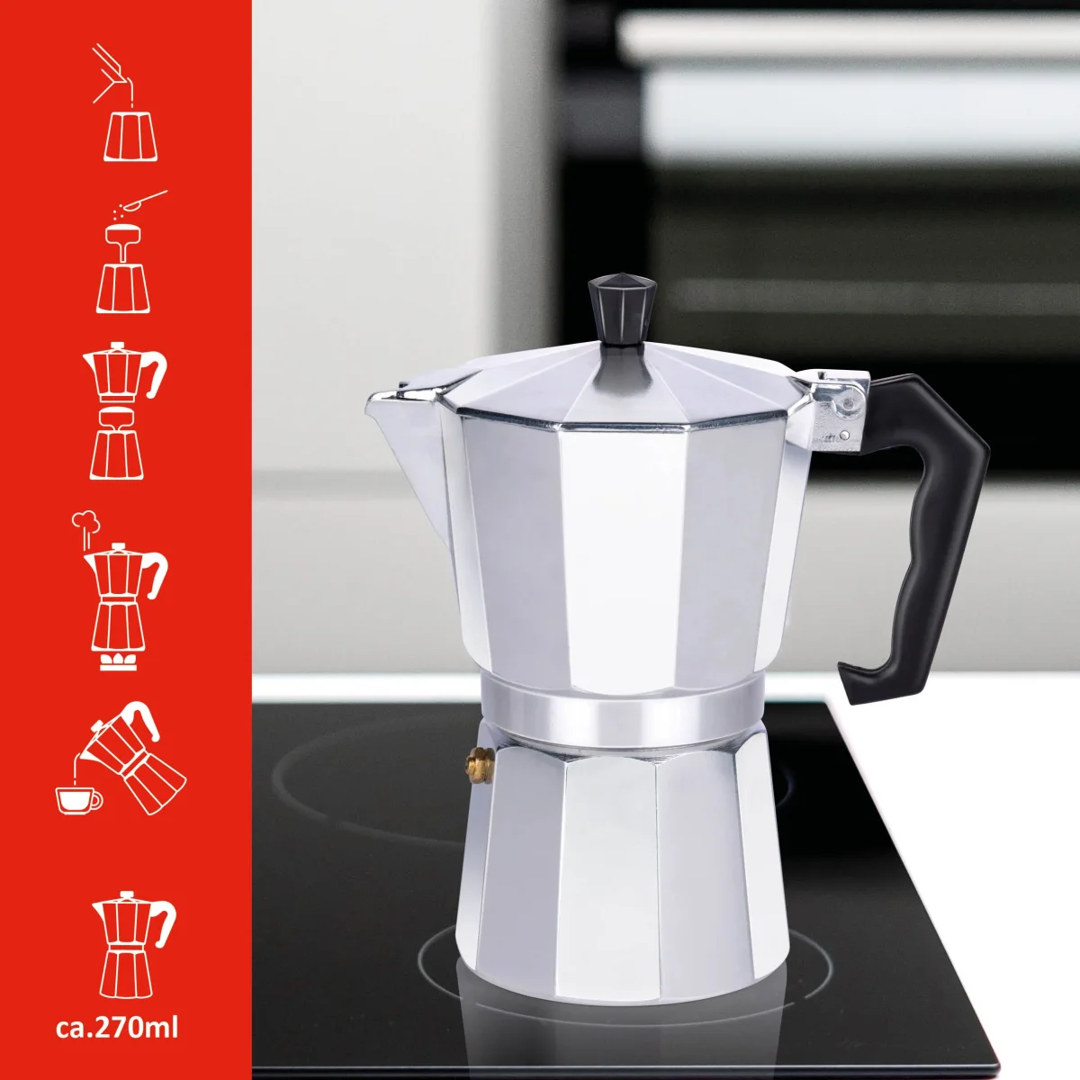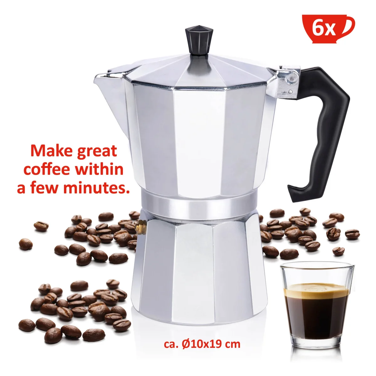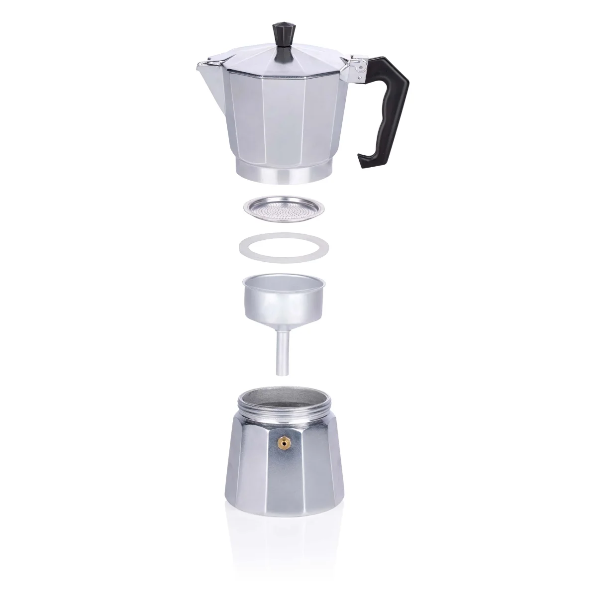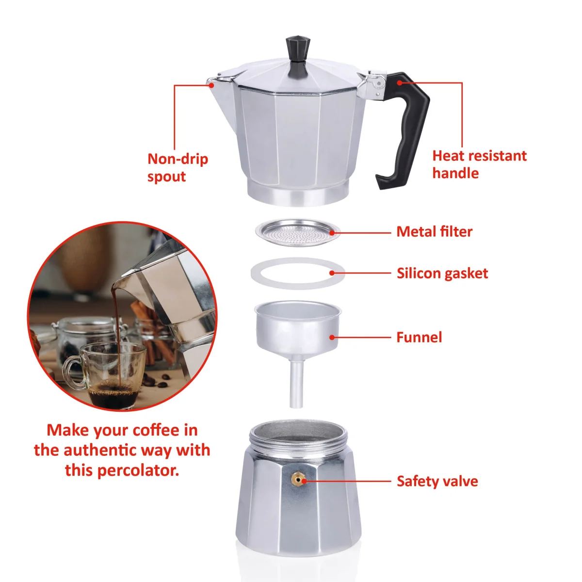 Geniet van een heerlijk kopje koffie, waar je ook bent, met de compacte en lichtgewicht percolator van Alpina. Deze koffiemaker is ideaal voor camperaars en kampeerders die geen elektriciteit nodig hebben om hun koffie te zetten. Vul eenvoudig het onderste deel met water en voeg je favoriete gemalen koffie toe in de filtertrechter. Plaats de percolator op je kookvuur, en binnen enkele minuten heb je een verse, warme drank tot je beschikking!