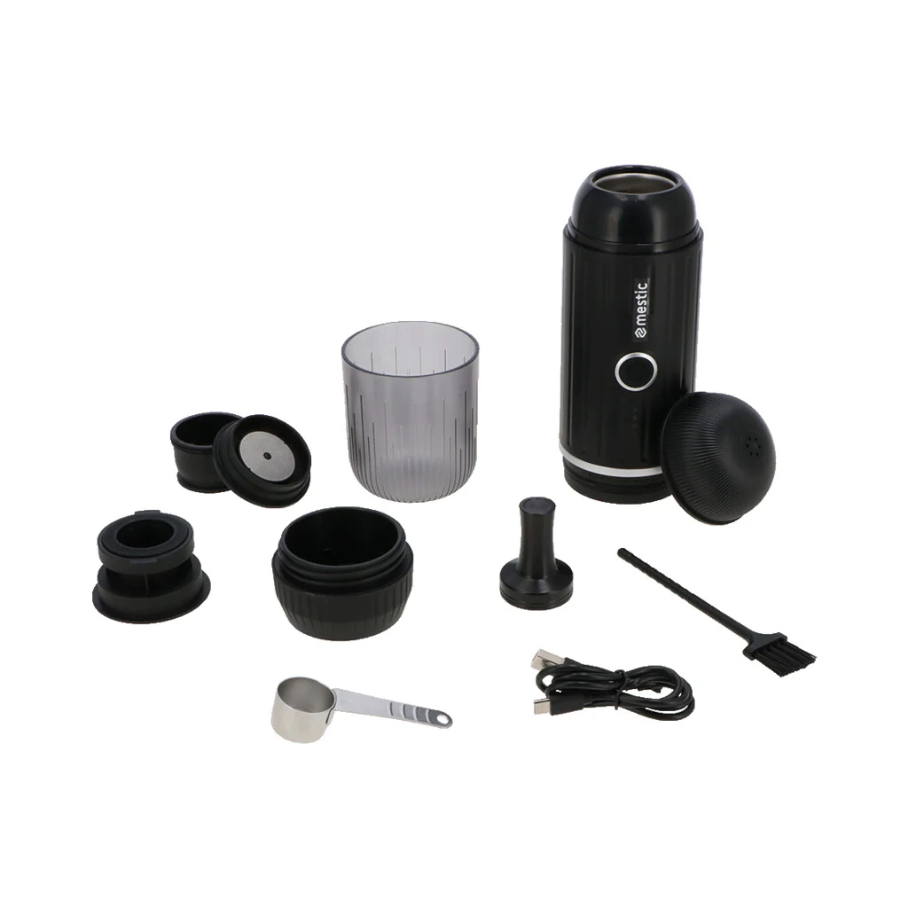 De Mestic MK-90 draagbaar koffiezetter beschikt over een compact, draagbaar, zwart design. Dankzij de 19-bar pomp zet je een rijke, volle espresso, zelfs zonder stopcontact. Met een ingebouwde lithiumbatterij van 7500 mAh kun je water verwarmen, espresso en koffiezetten waar je maar wilt. Het apparaat werkt met zowel espressocapsules als gemalen koffie, zodat je altijd jouw favoriete smaak kunt kiezen. Ideaal voor onderweg, op de camping of tijdens een dagje buiten.