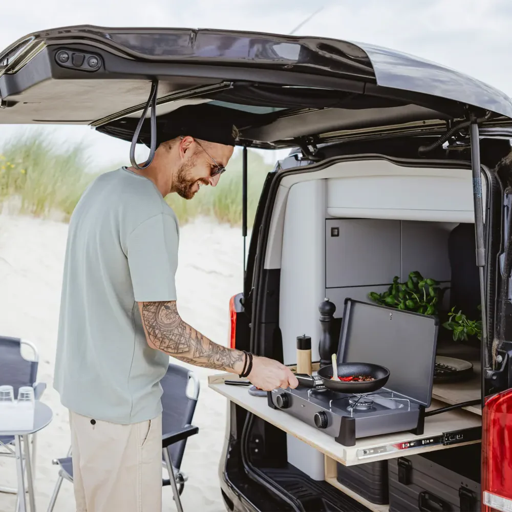 De stevige pansteun garandeert een veilige en stabiele plek voor je pannen, zelfs op ongelijke ondergrond. Aansluiten kan flexibel op een gasfles, schroefcartouche of rechtstreeks op de gasaansluiting van je camper of caravan.