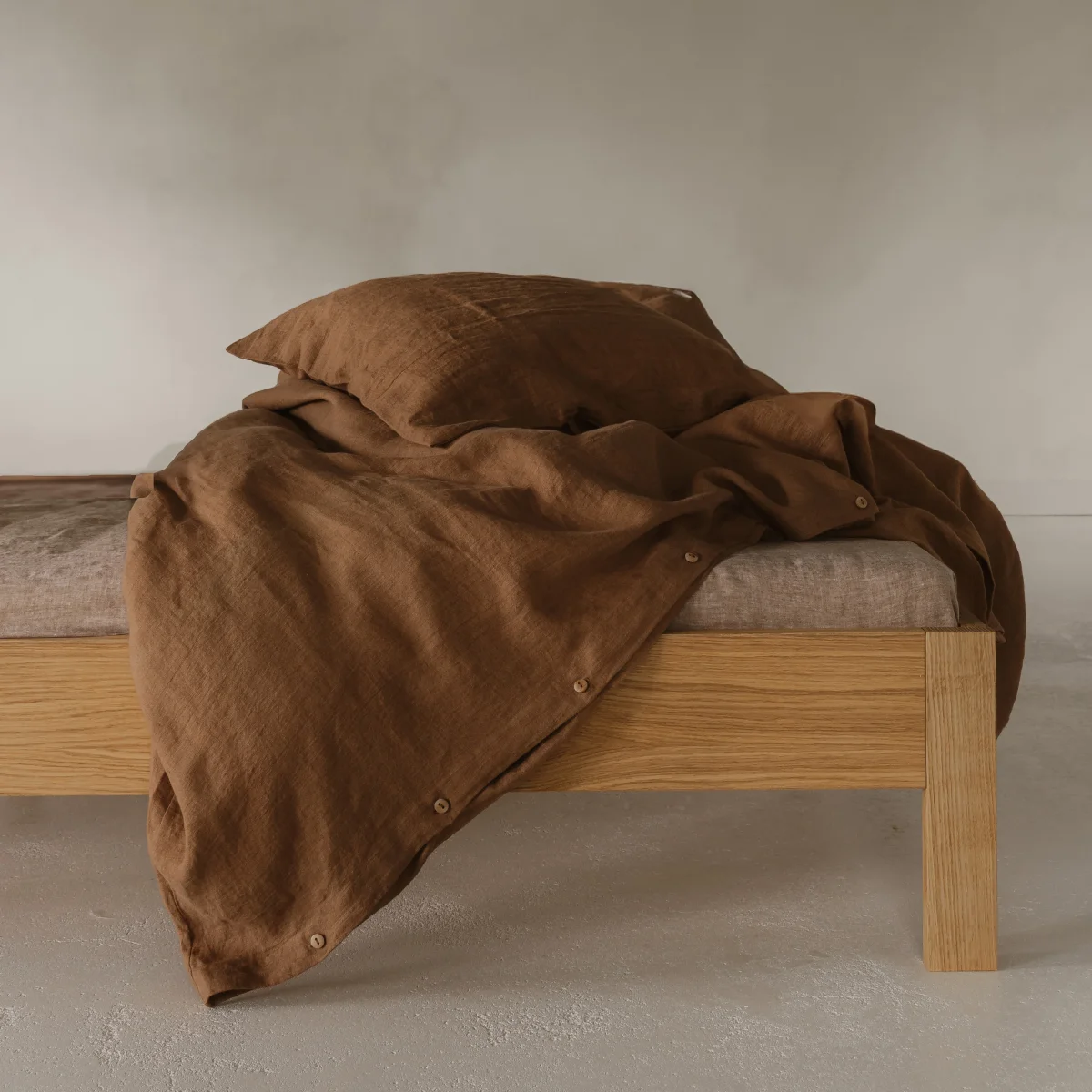 Linen duvet cover made of 100% pre-washed pure European linen in cinnamon. Cinnamon is a rich, earthy tone that brings lots of character to a space. Combine it with hazel, grey and blue shades for a cosy, warm home.