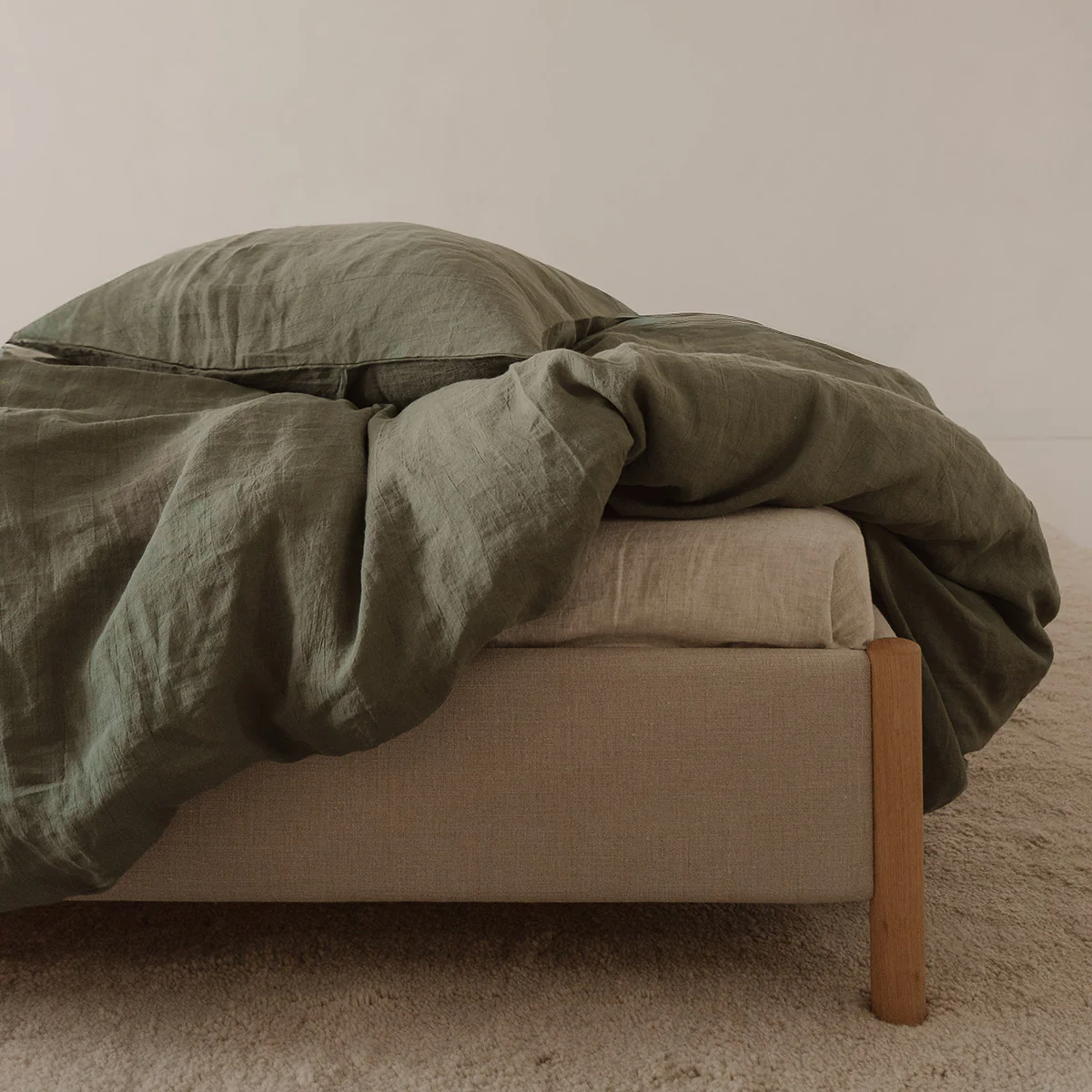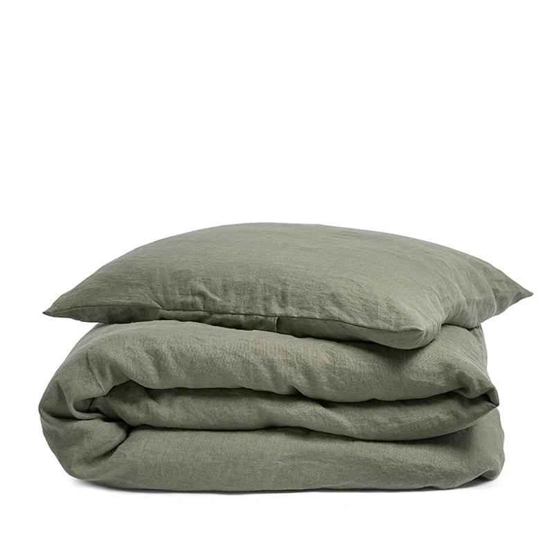 Linen duvet cover made of 100% pre-washed European linen in olive. Olive is a faded green like the leaves of an olive tree. Beautiful on its own or in combination with light shades like misty grey and sage.