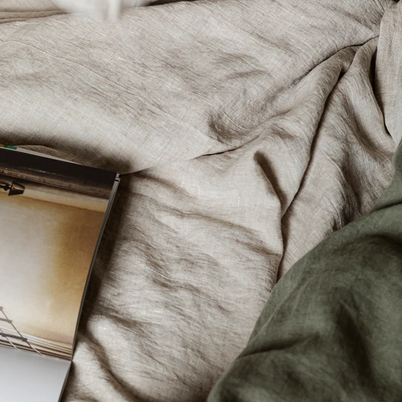 Linen flat sheet made of 100% pre-washed linen in flax. A natural, earthy shade, chambray woven with flax and off white yarn.