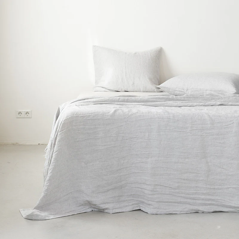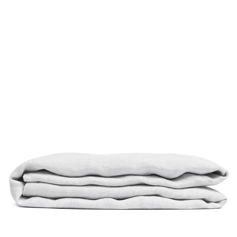 Linen flat sheet made of 100% pre-washed linen in misty grey. A versatile light grey with a subtle blue undertone. Chambray woven with light grey and off white yarn.